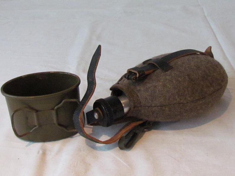 The cup is marked MN44 and the bottle is marked HRE44. The entire canteen is in mint condition and hasnt been issued. A very nice late war unissued item.