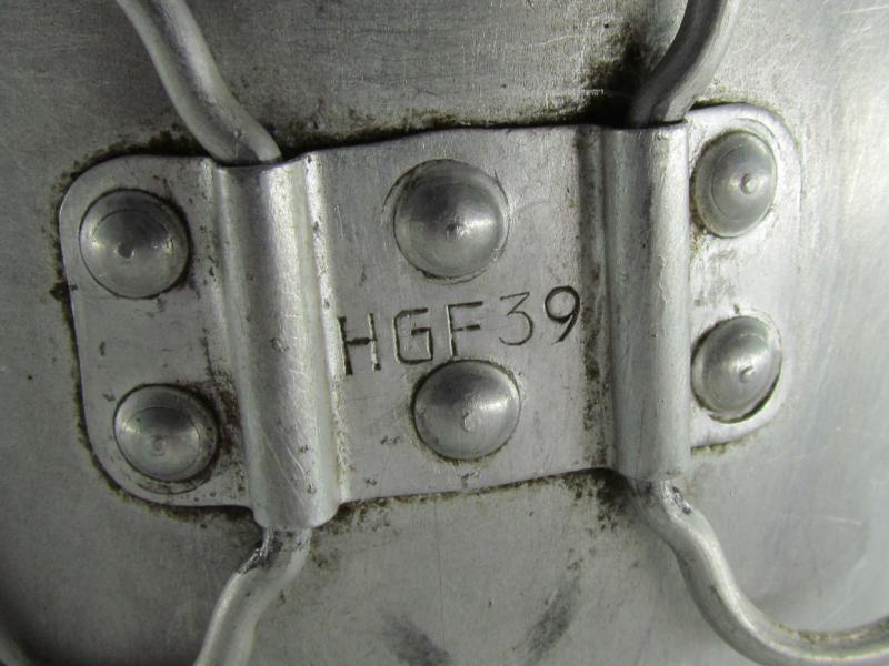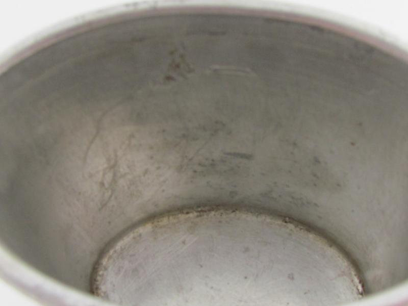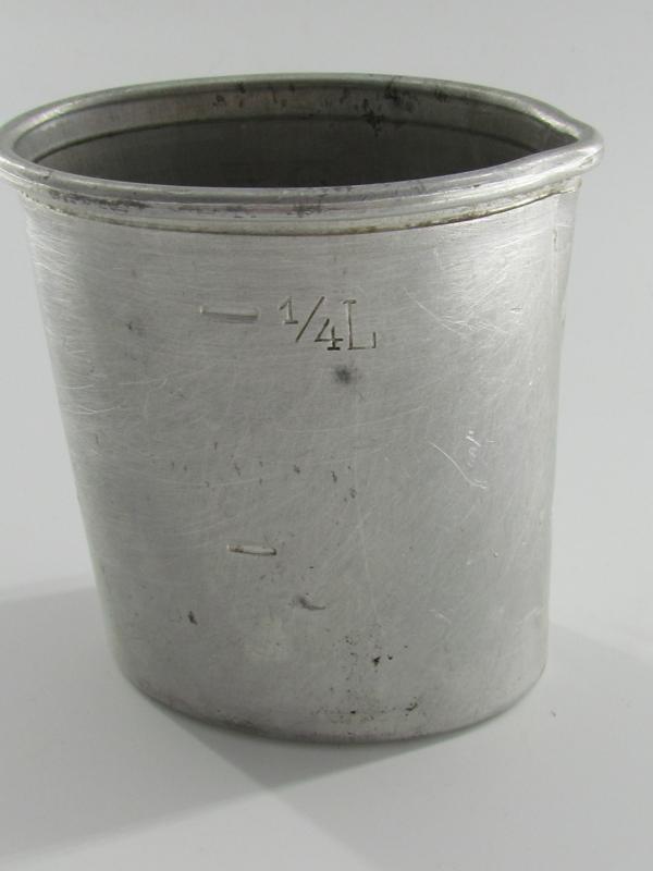 De beker is gemarkeerd met 1/4 L en HGF 39. This cup is a taller variant of the normal drinking cup and is made of alluminium. It is marked HGF39 and 1/4L which means 25cl.