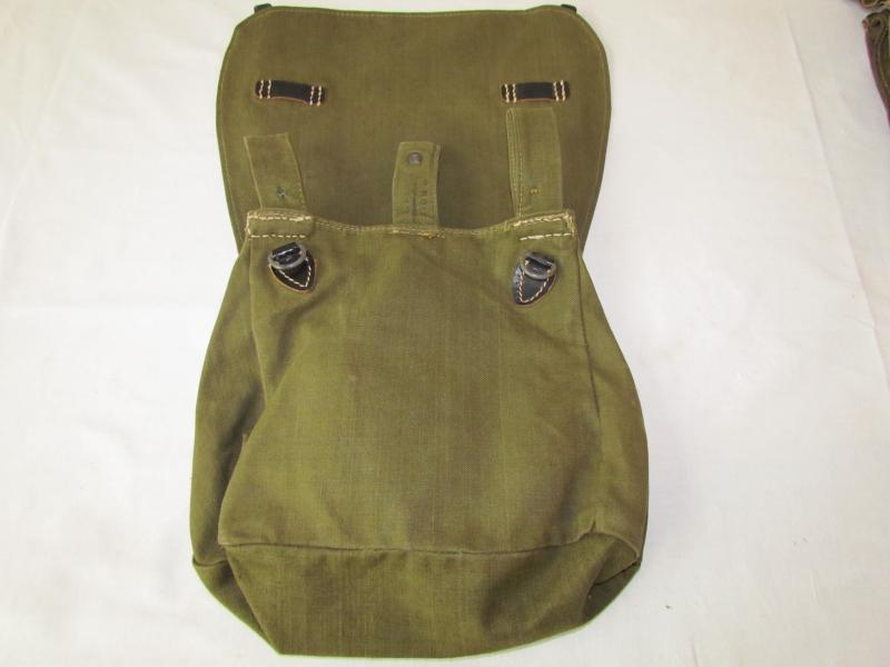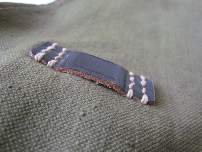 The breadbag is in mint condition and is marked 1943 on the cloth of the carrying strap. It is nicely constructed of black leather parts on the outside and brown leather parts on the inside.