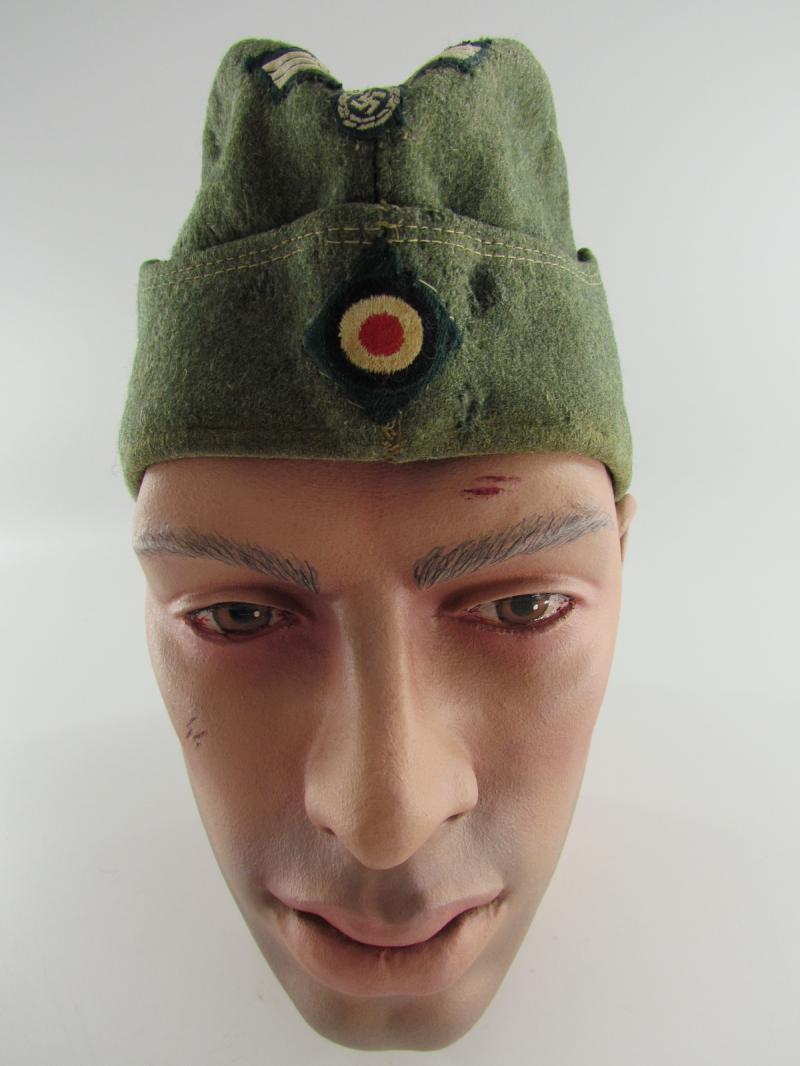Very nice worn Heer overseas cap! The cap retains its original 2 piece insignia which are handapplied. The cap has a very very small hole on the top but isnt visible when worn.
