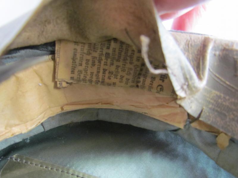 The cap shows some nice wear, and has some paper sewn between the leather and the outside to keep the visor in shape