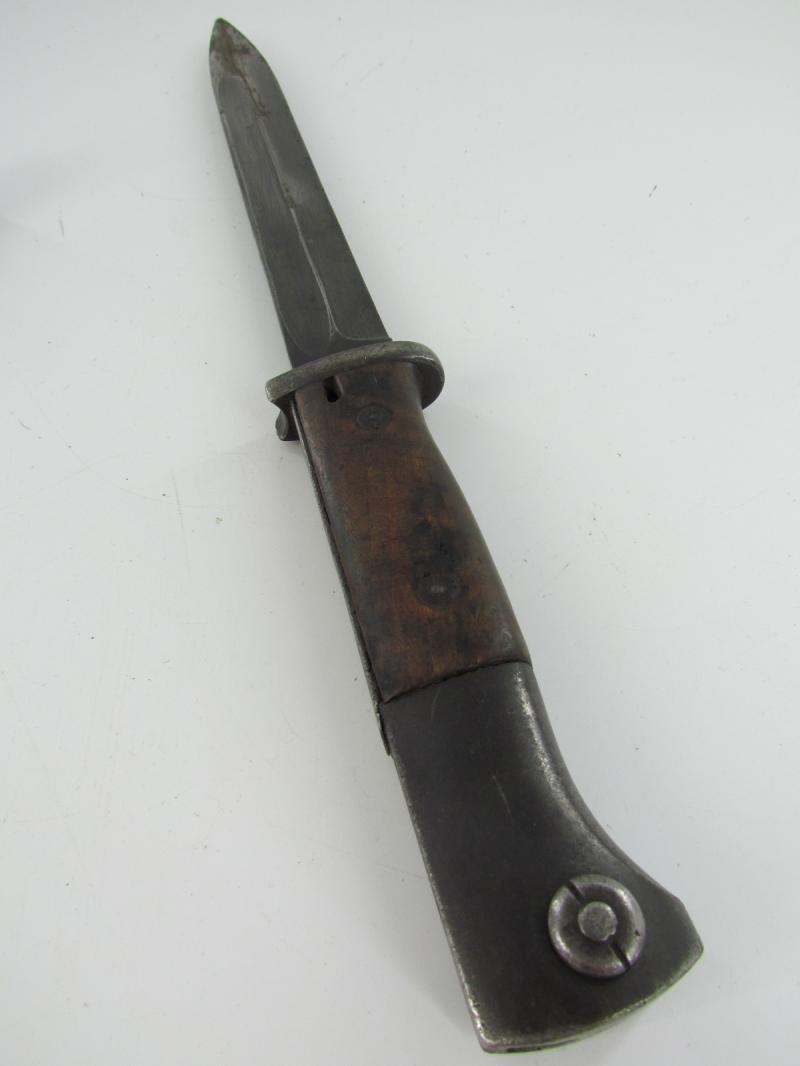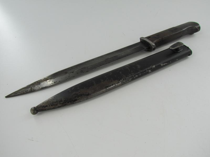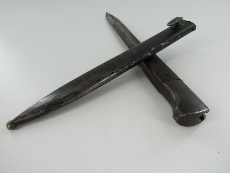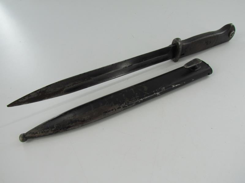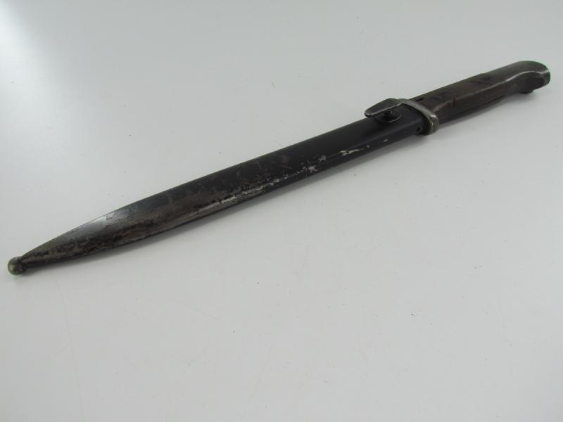 Unmarked k98 bajonet with wooden grips Only serial number visible on the end of the grip an WaA stamps Scabbard marked with serial number