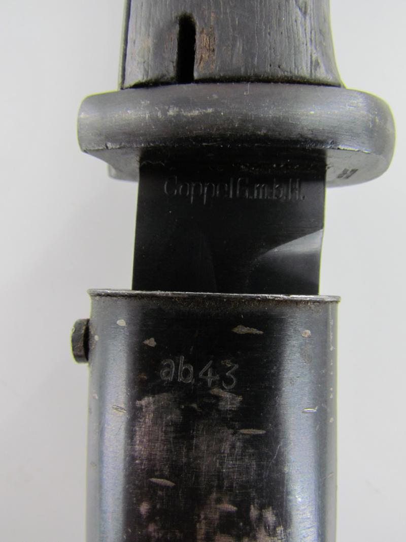 The maker is Coppel G.m.b.H. The Bajonet is in a very fine condition and has several markings on it. The blade is like new. The scabbard is mis-matched and marked ab43.