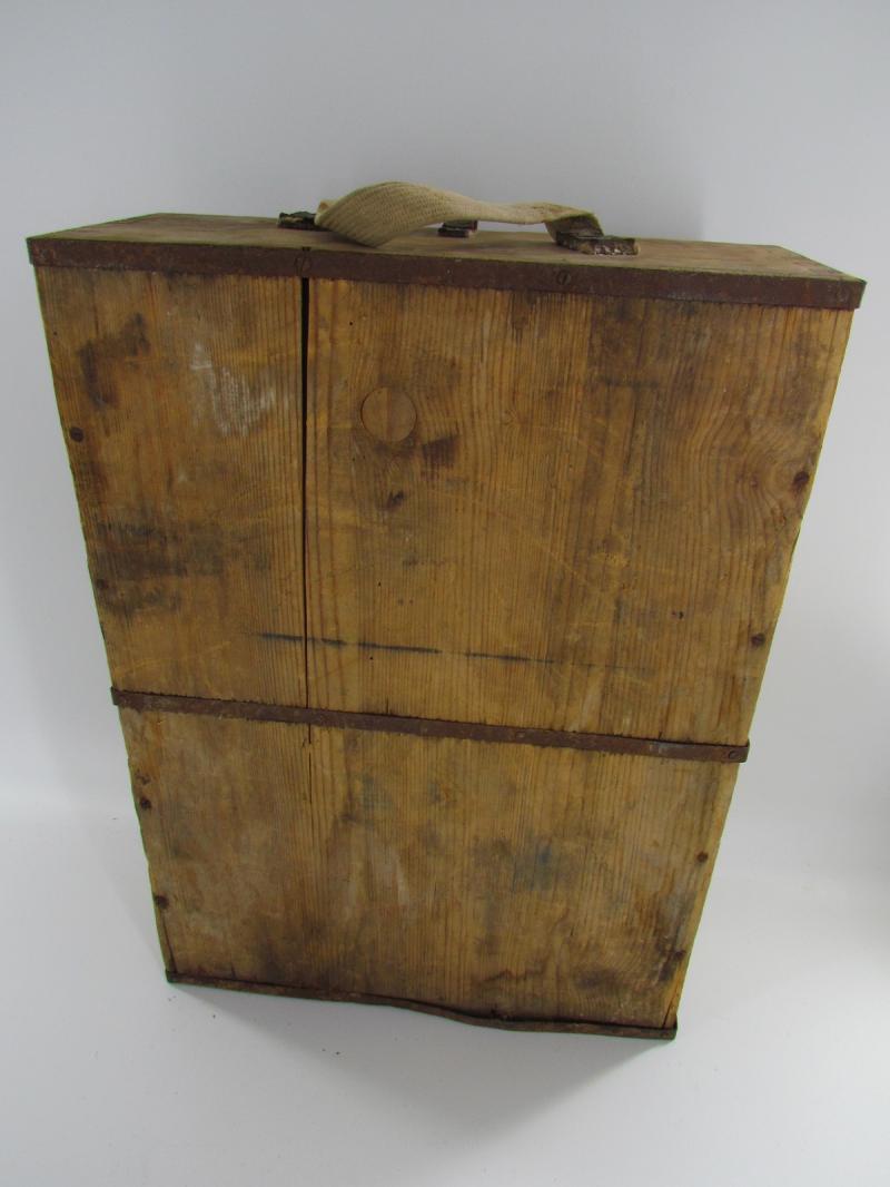 The box is in worn and used condition with the webbing strap removed, and the leather in hard condition with one leather strap on the backside broken ( hence the price ).
