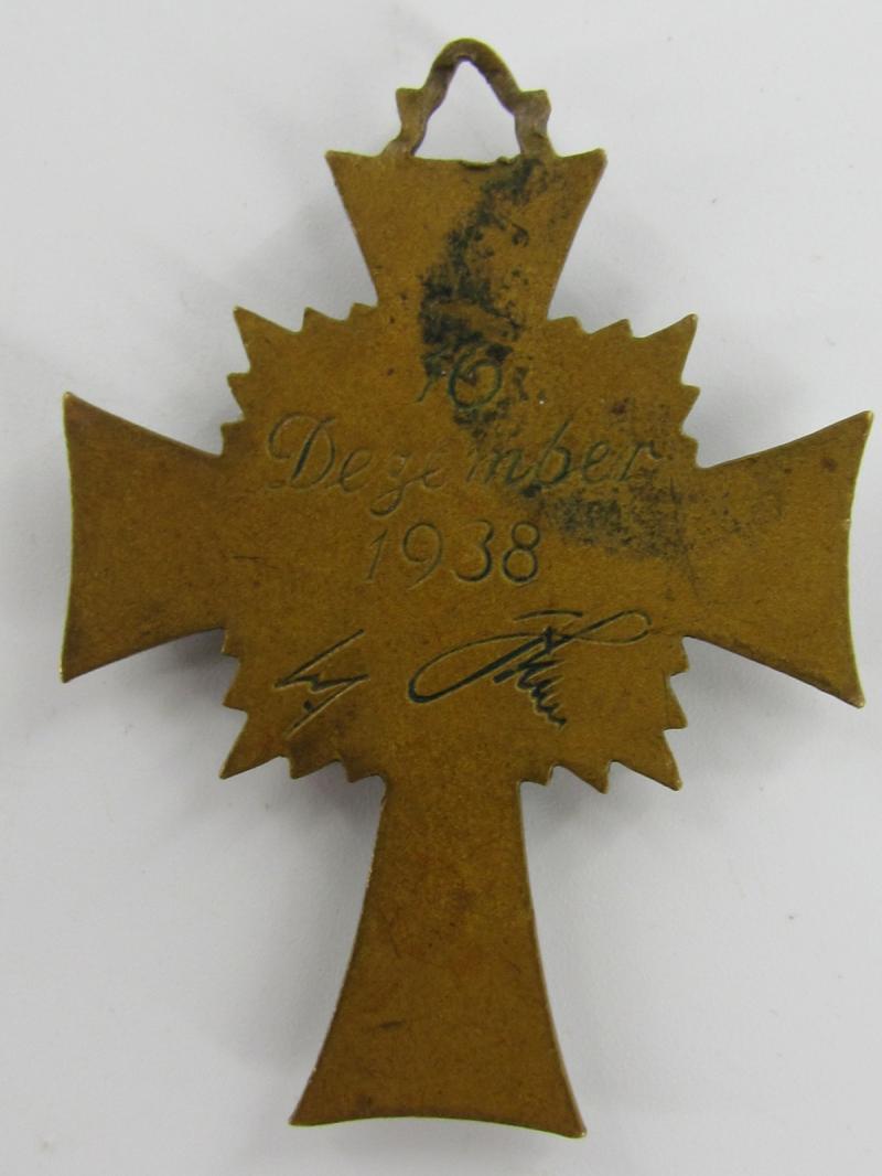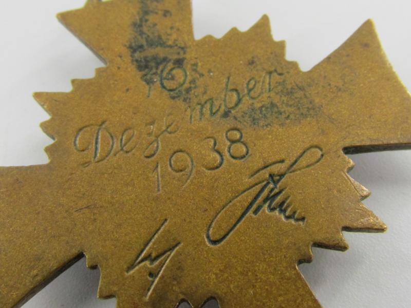 A German Mother's Cross in Bronze. As all marked 16 December 1938 with 2 signatures. The ribbon is not present used condition