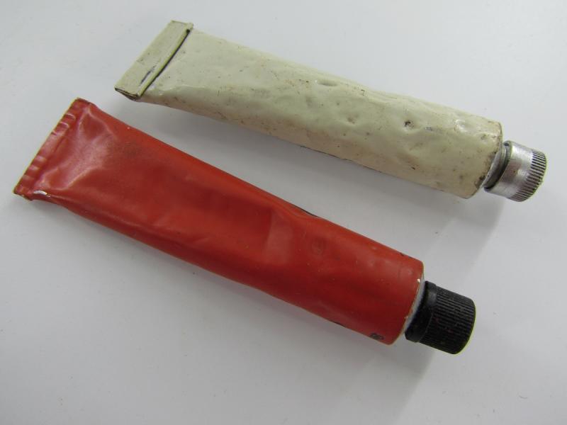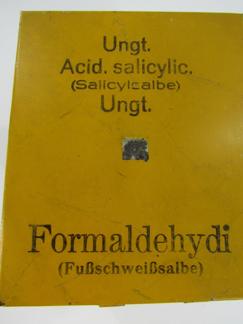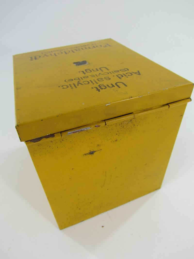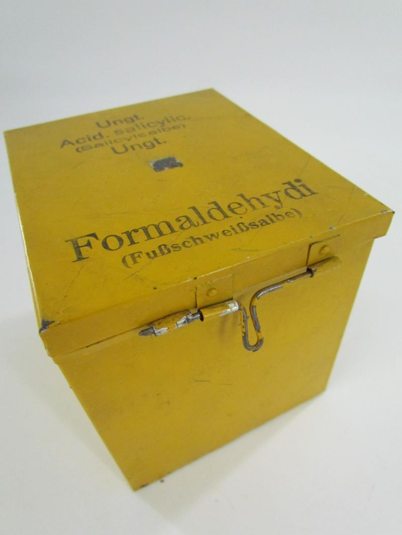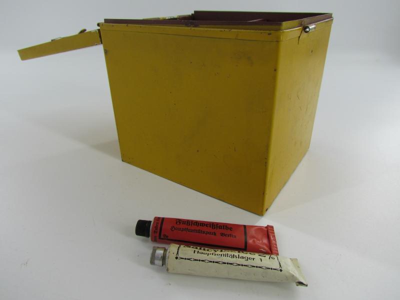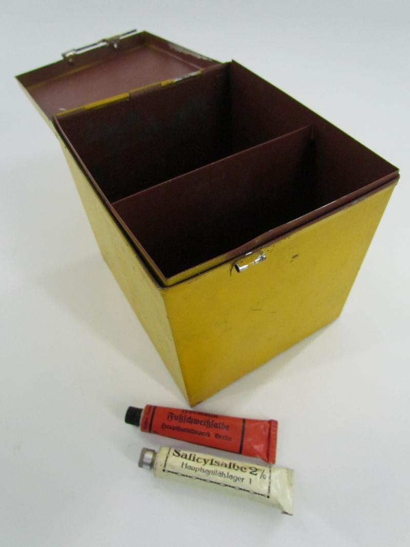 Nice original metal medical unit box which holts tubes with foot ointment. In originel paint and 2x unissued tubes included Great for a medical display! In very good condition.