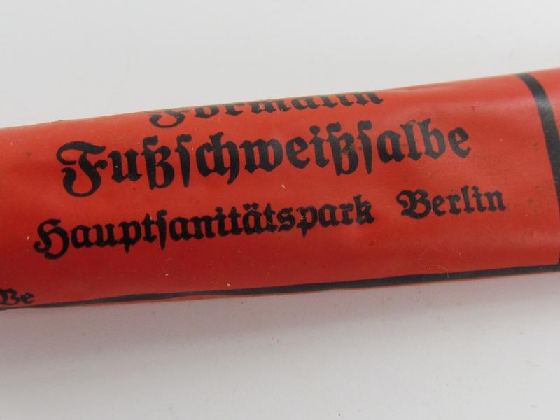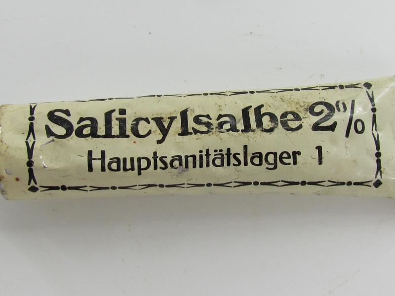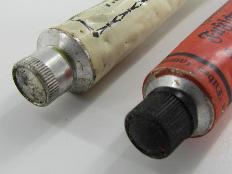 Set of 2 Wehrmacht Medical Ointment Tubes. One for 'Salicylsalbe, Fußheilsalbe and one red coloured 'Fußschweißsalbe' tube 2x set on stock A very Nice original set of medical ointment tubes