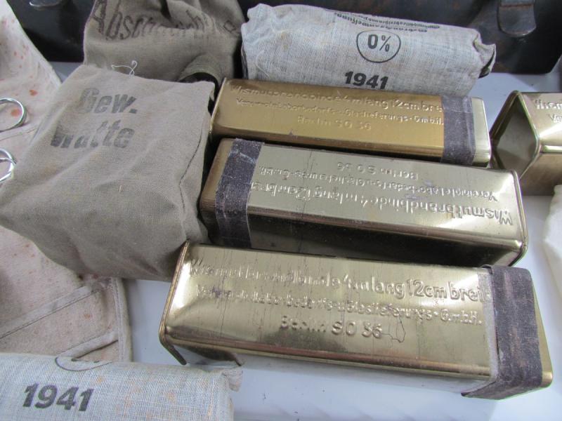 The box is complete with a large part of its original contents, including some nice and interesting original bandages and various other medical items