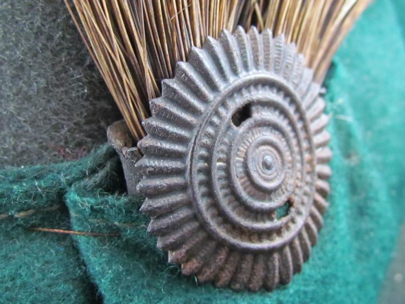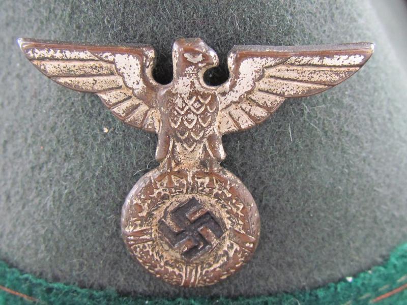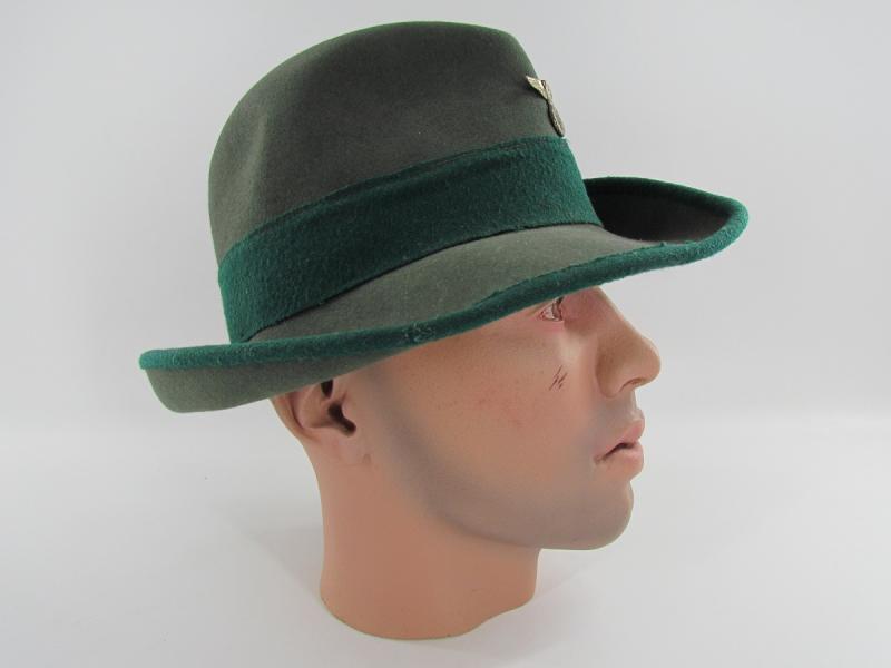 It is made from soft grey-green fur or wool felt (rarer variant) decorated by a dark-green hat band and edging around the brim