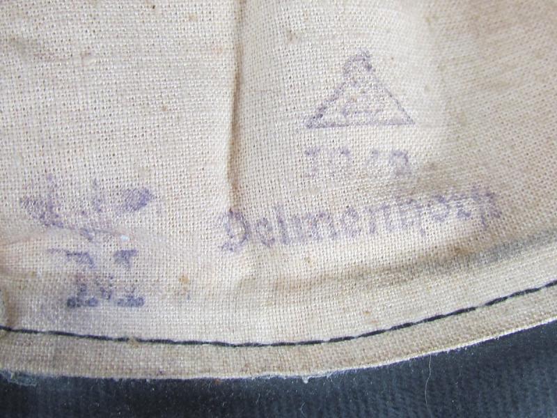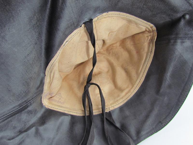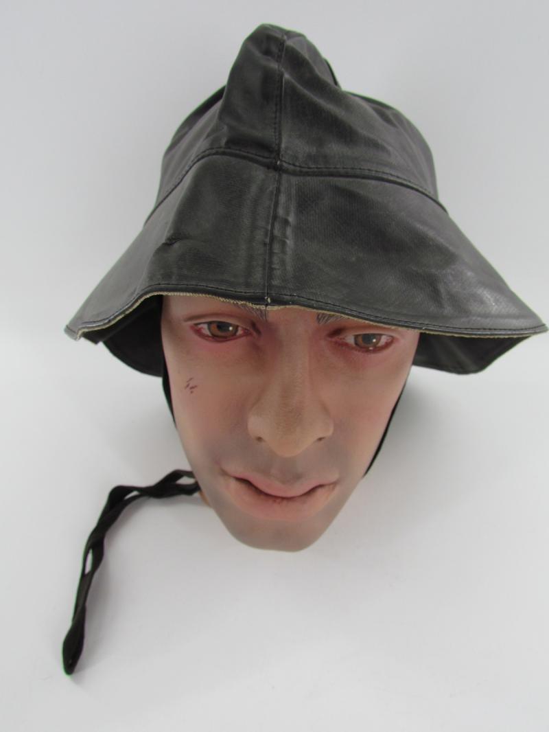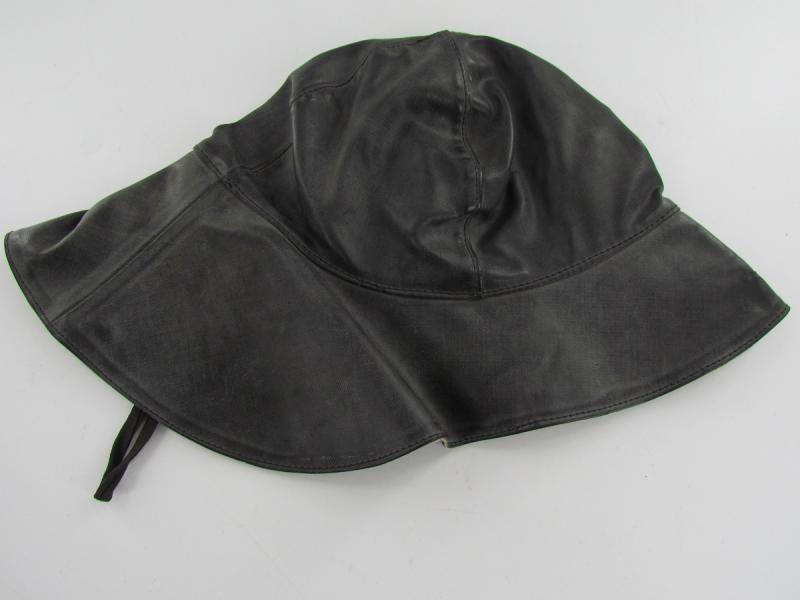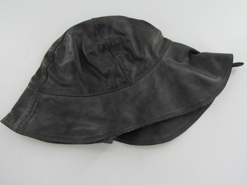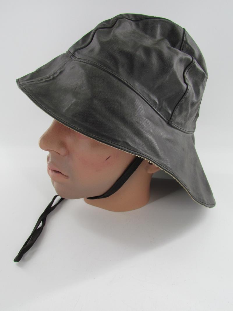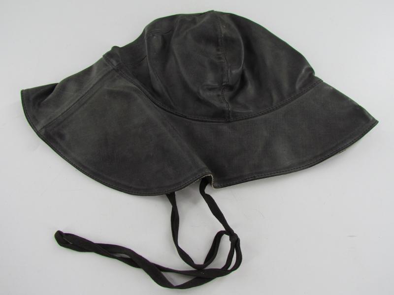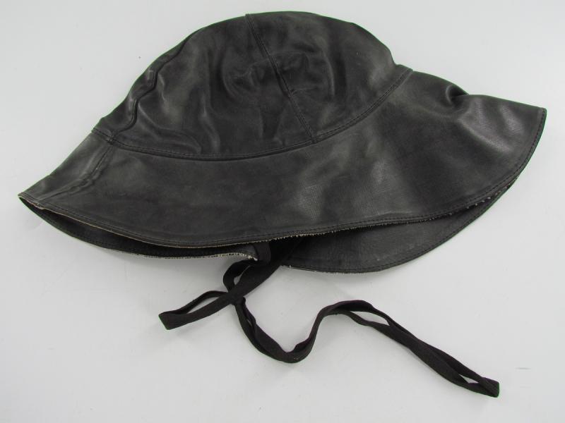 In unissued condition and maker marked 1942 KM Stamp also inside A period Kriegsmarine foul weather protective cap. Black rubberized material construction
