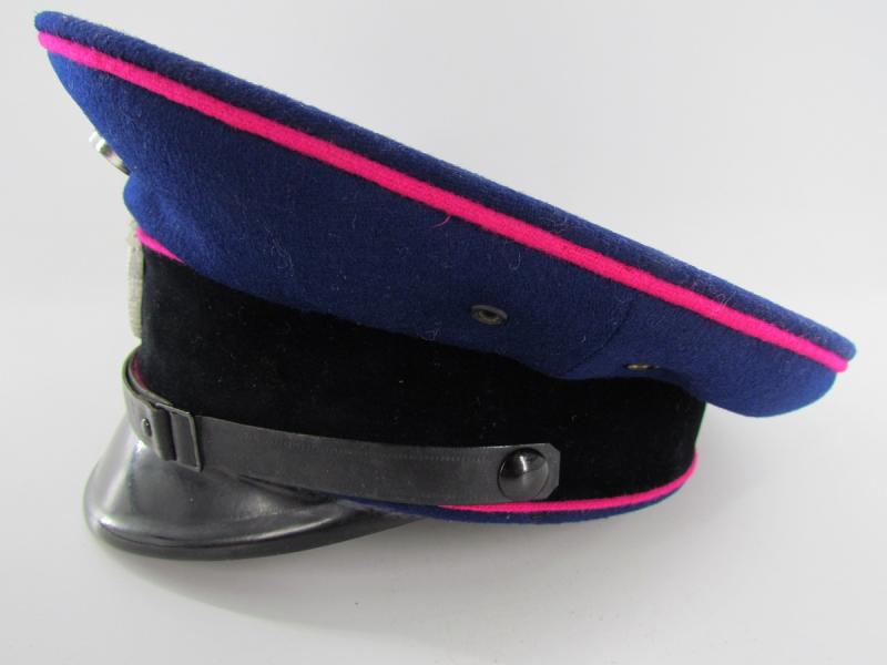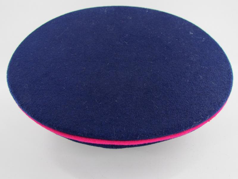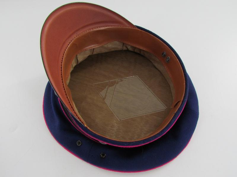 It is fabricated from very dark navy blue worsted wool cloth, with wide black velvet cap band, plus two rows of saddle carmine red (karminrot) color piping around the circumference.