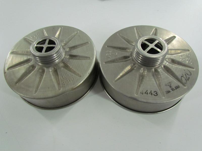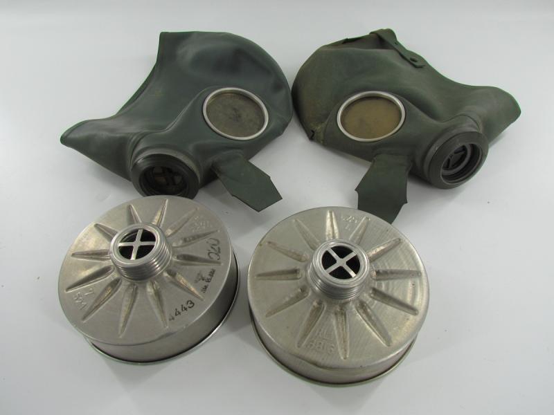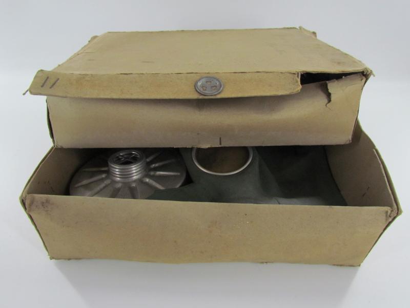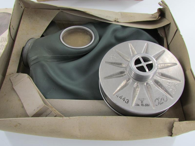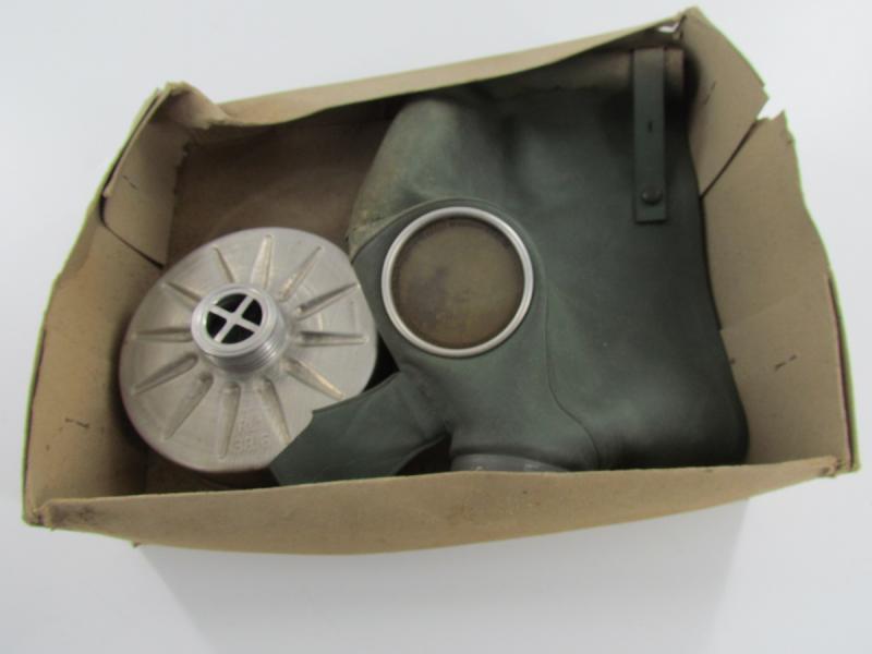2x German Volksgasmaske in original box 1x in very good condition and 1x in poor condition with cracks in it 2 x filter and 1 x original manuel included