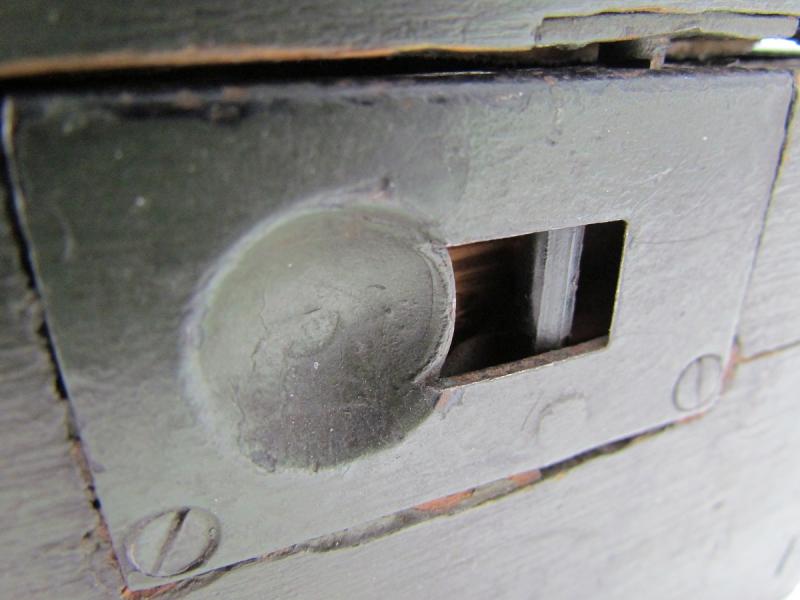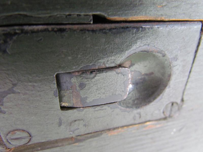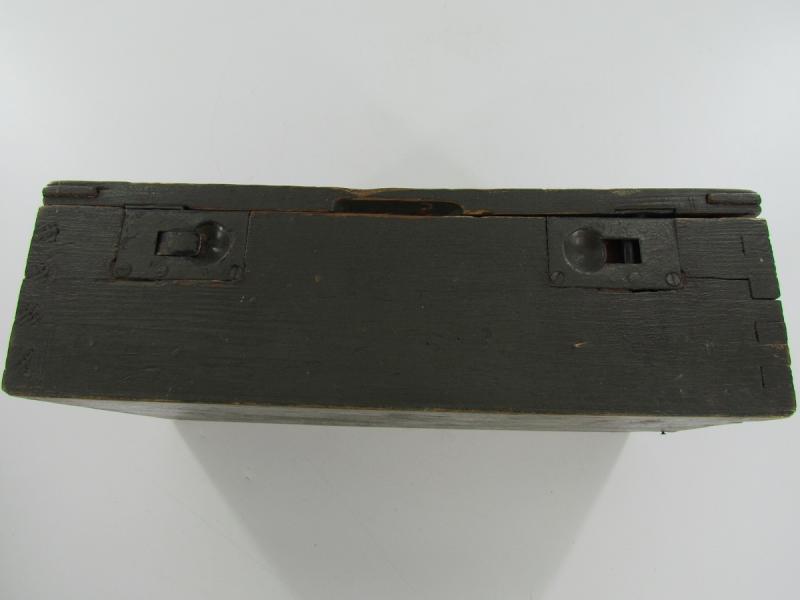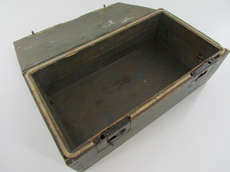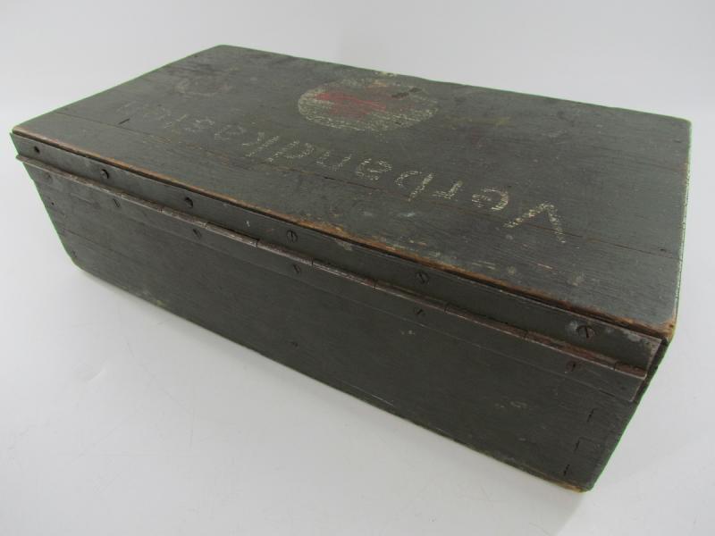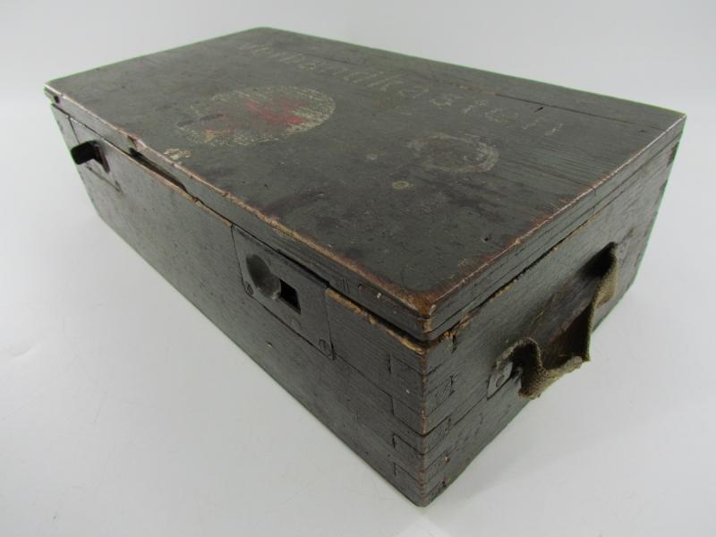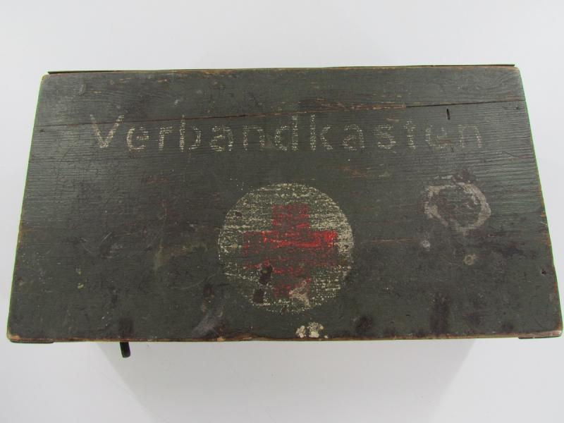 Later in the war the German vehicle first aid kit or “Verbandkasten” was made out of wood in stead of steel I a used condition. The locking mechanism is broken on one side