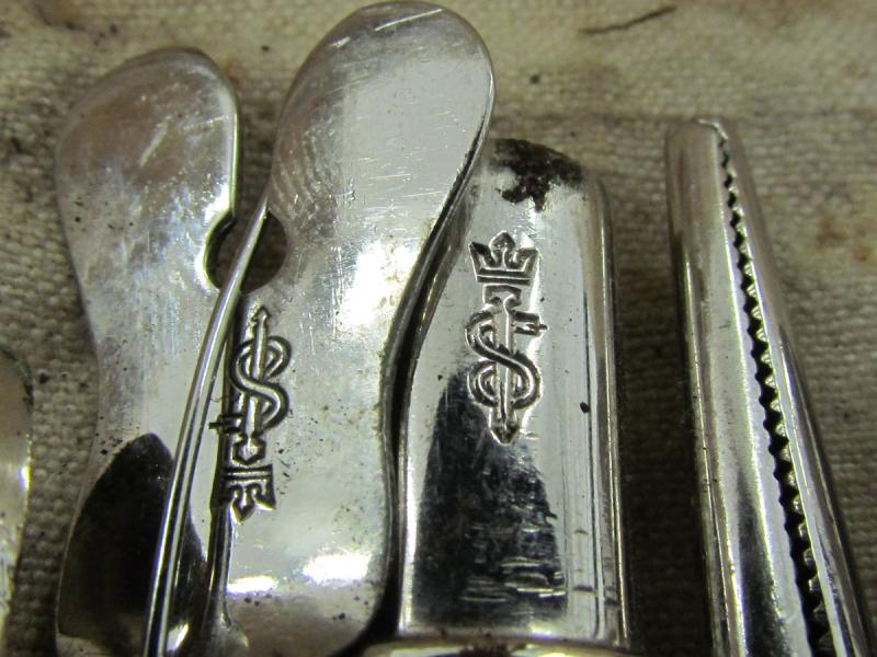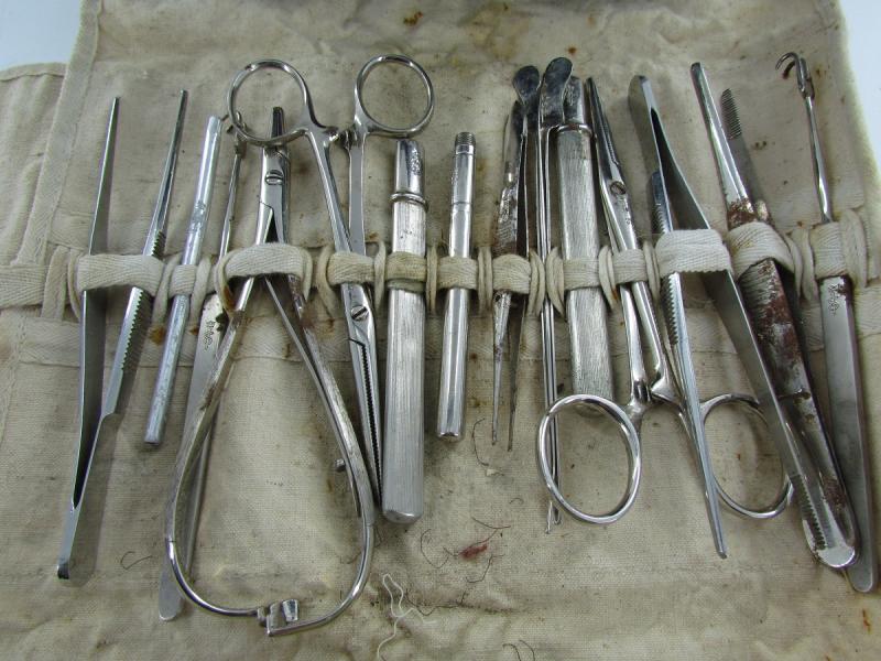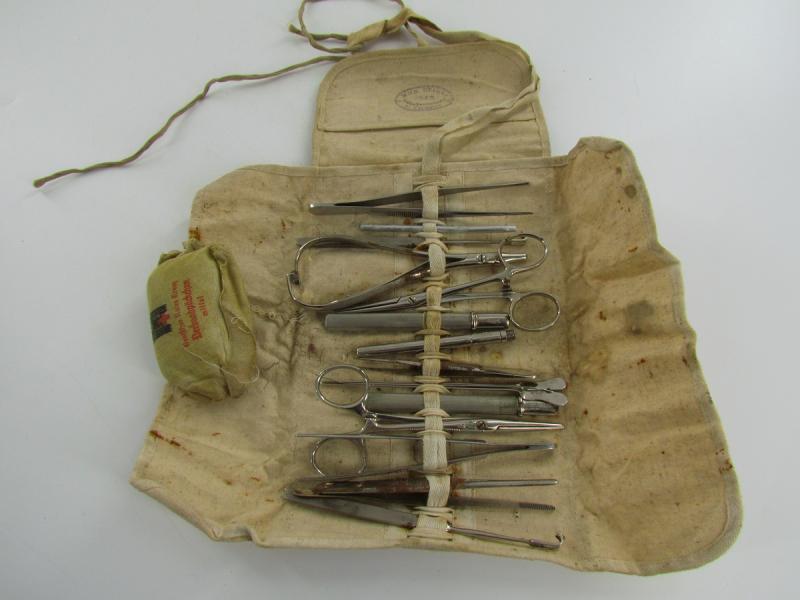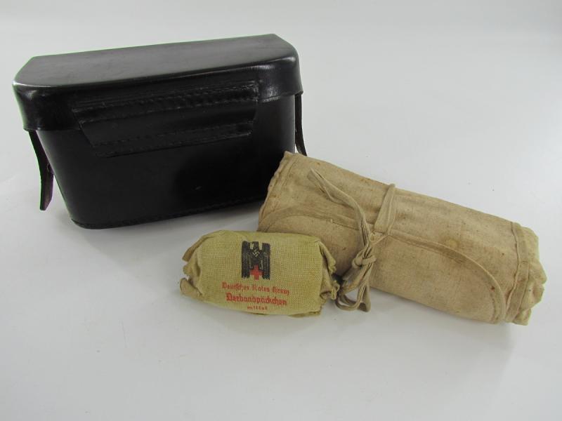 Black medical pouch which includes surgical tools and also DRK marked bandage