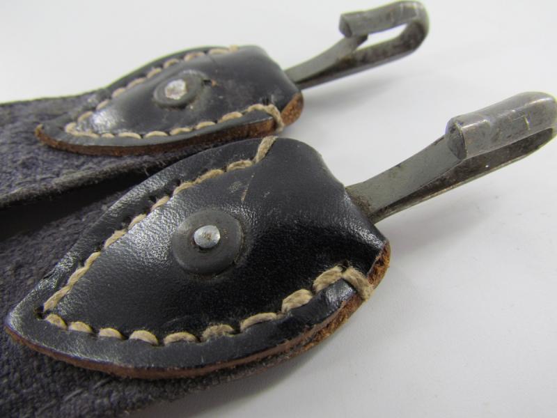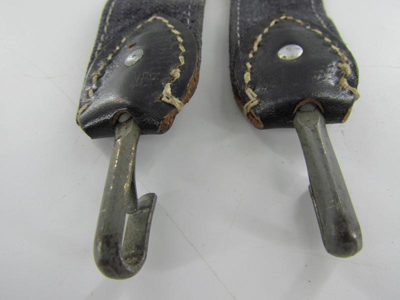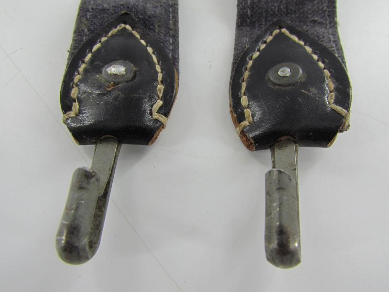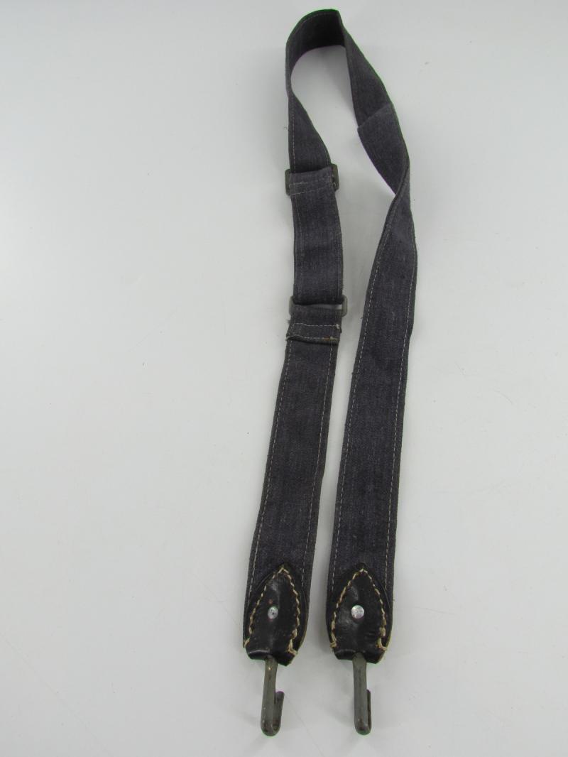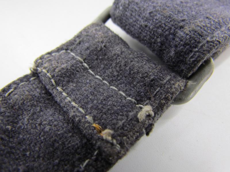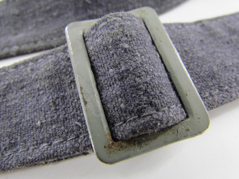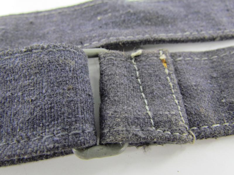 In a used condition a Luftwaffe breadbag strap Nice dark blue/grey canvas construction breadbag strap with leather reinforced steel friction clips to either end