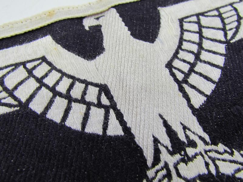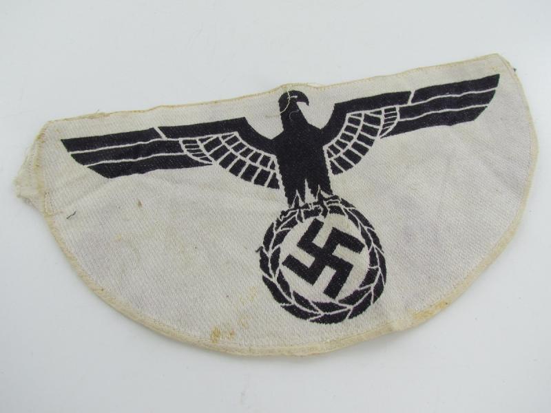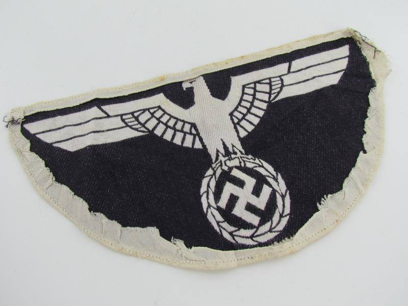 The insignia consists of a white, rayon, half-moon shaped base with a black, machine woven, national eagle, with out-stretched wings, clutching a wreathed, canted swastika in it’s talons, to the center.