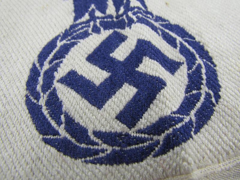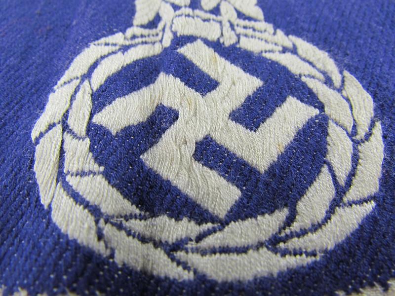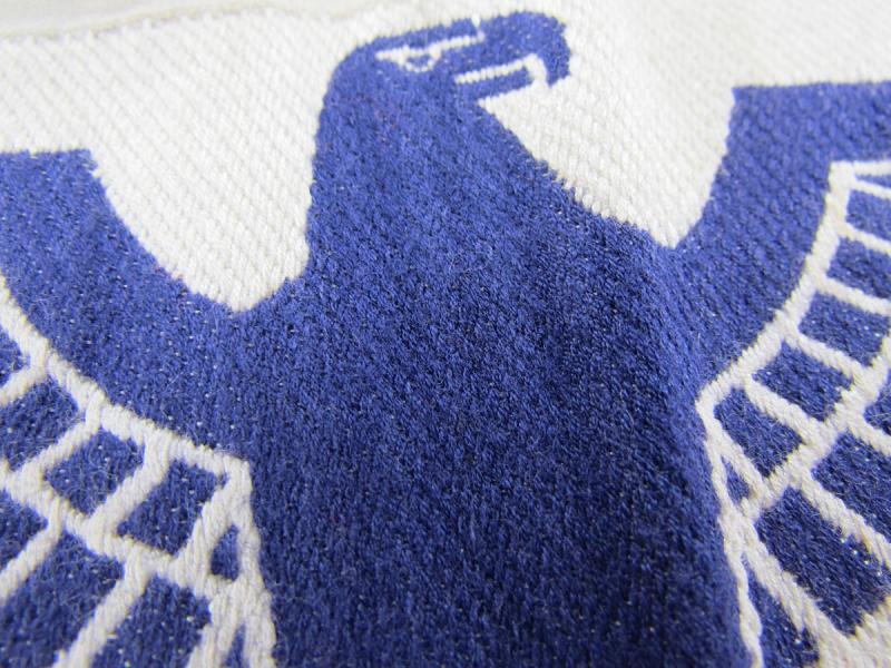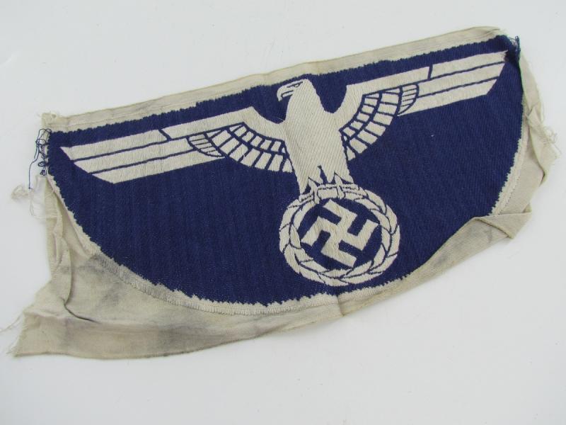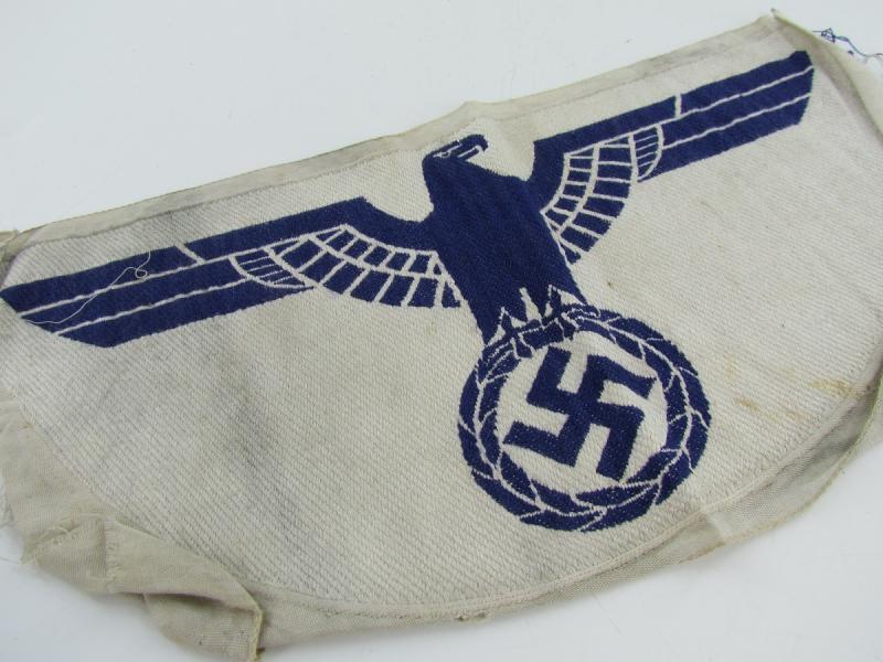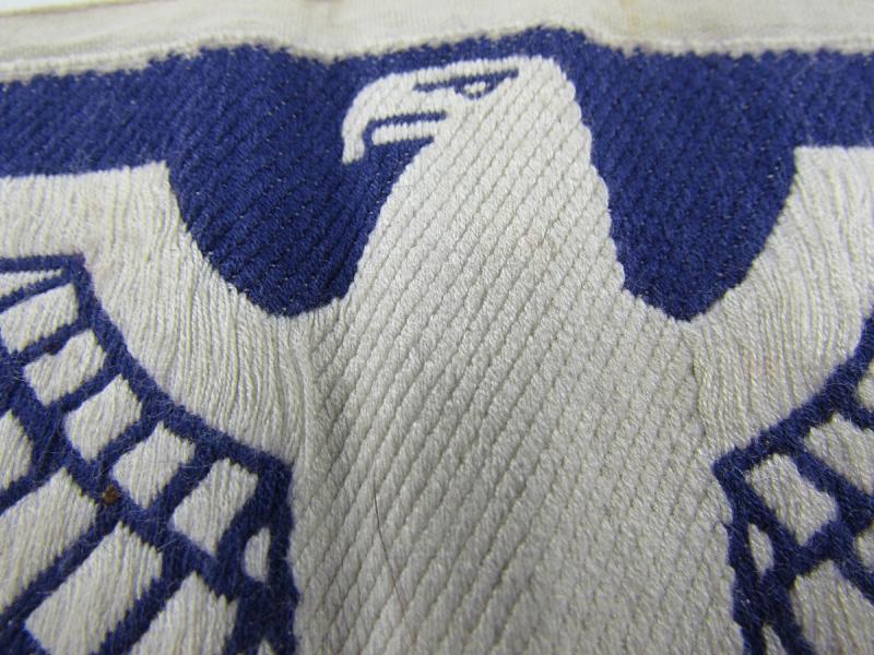The insignia consists of a white, rayon, half-moon shaped base with a black, machine woven, national eagle, with out-stretched wings, clutching a wreathed, canted swastika in it’s talons, to the center.