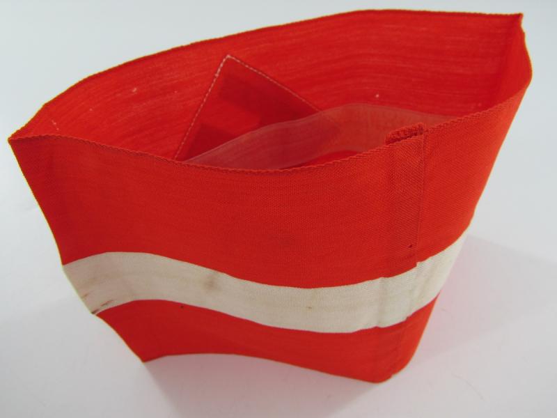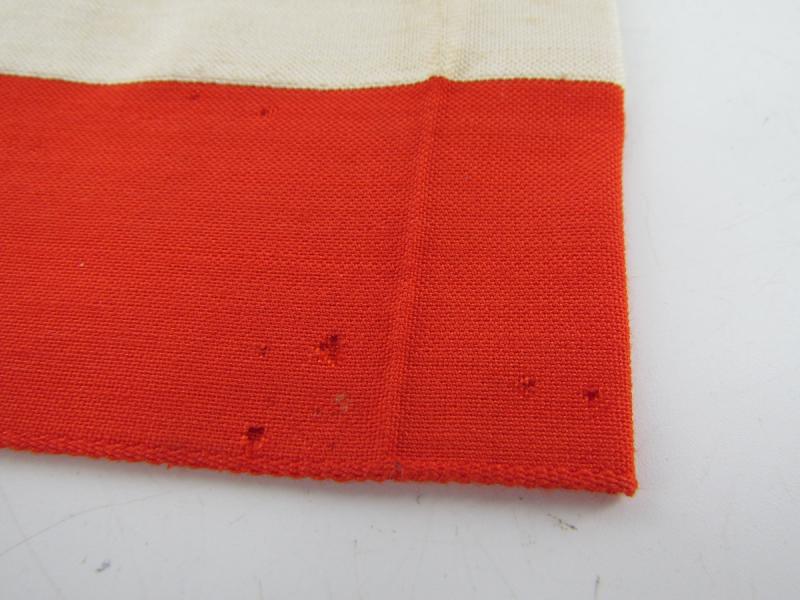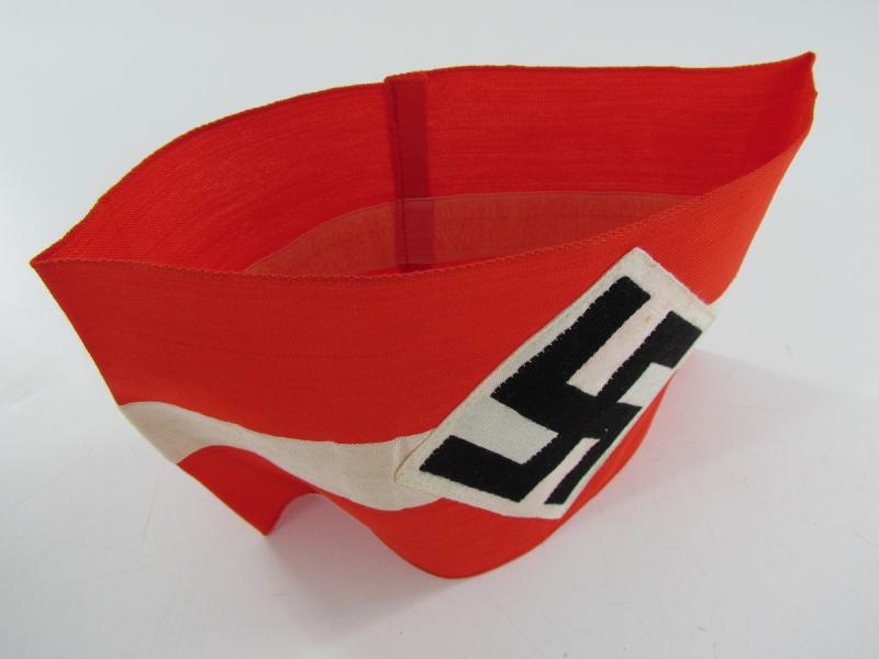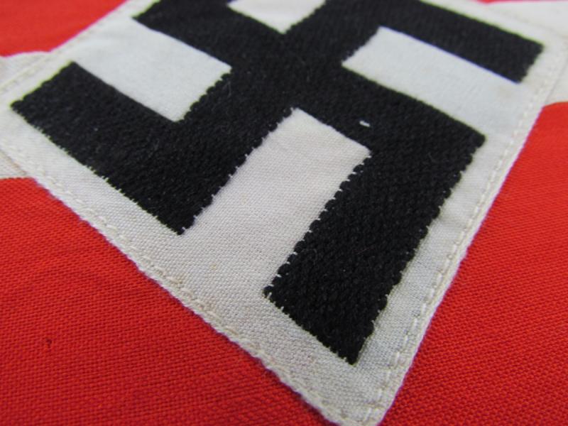 This is a nice Hitler-Jugend Member's Armband (Armbinde) as worn by HJ members on the upper left sleeve on almost all HJ uniforms. The multi-piece construction red coloured armband shows an white stripe in the middle and has a white diamond, with black-coloured BeVo-woven mobile swastika, attached.