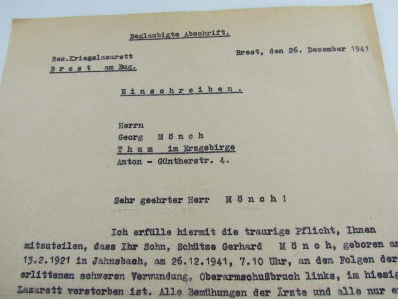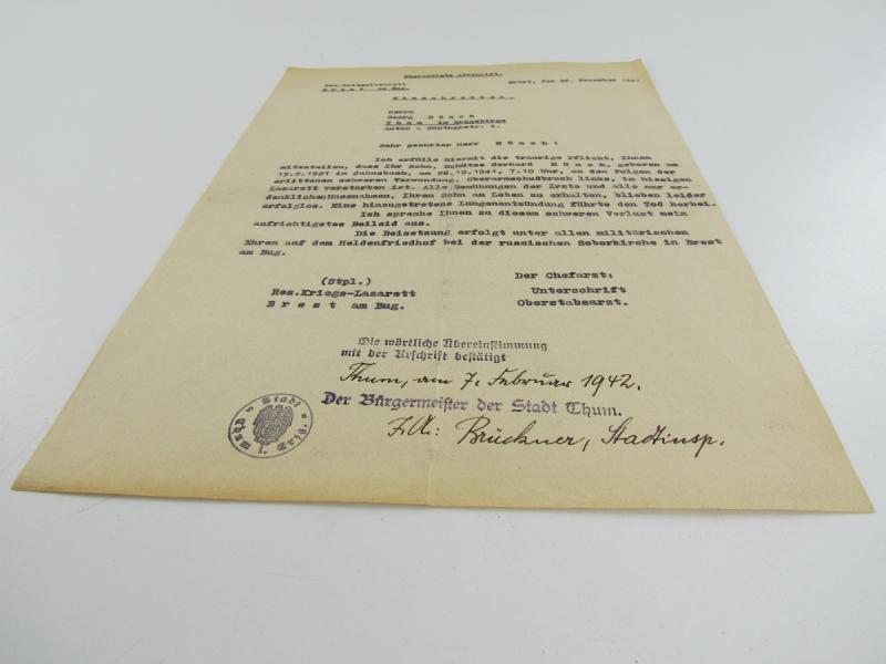 Death Notice To Father Of Soldier written by the Field hospital to the father of Schütze Gerhard Mönch signed by the mayor of the city where he was comming from