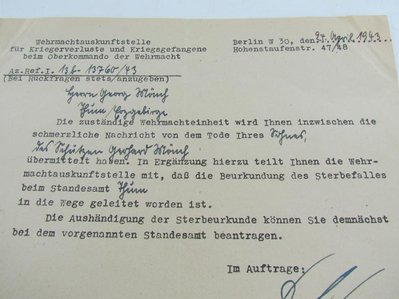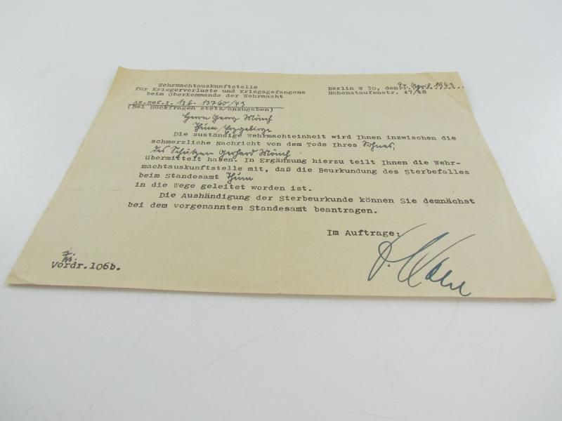 Death Notice To Father Of Soldier written by the Wehrmachtsauskunftstelle ( Wehrmacht Information Centre ) Nice for every personal items collection