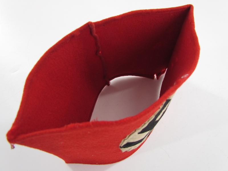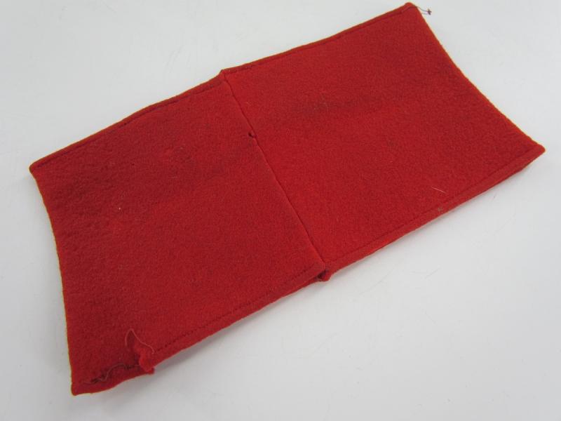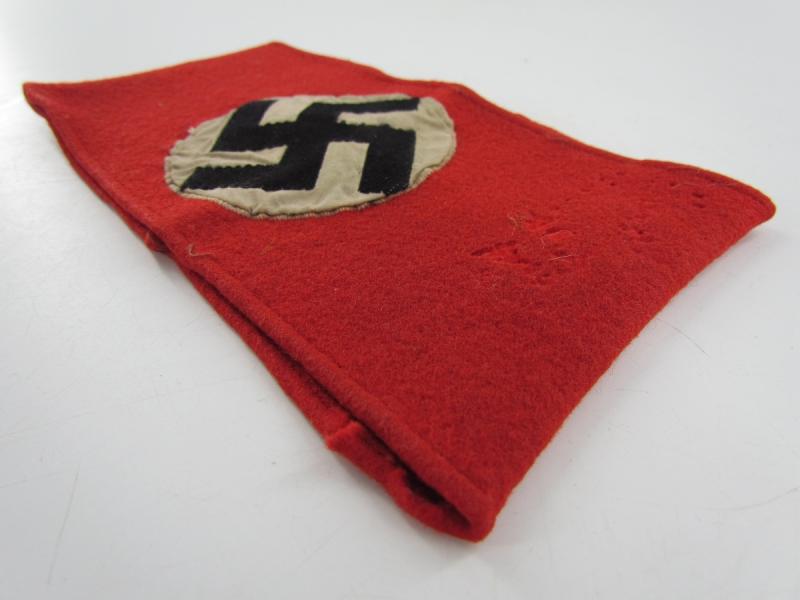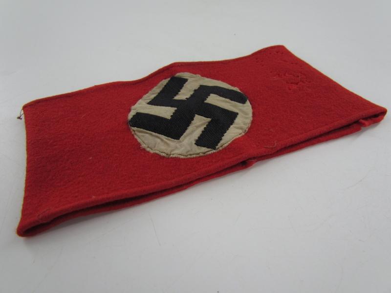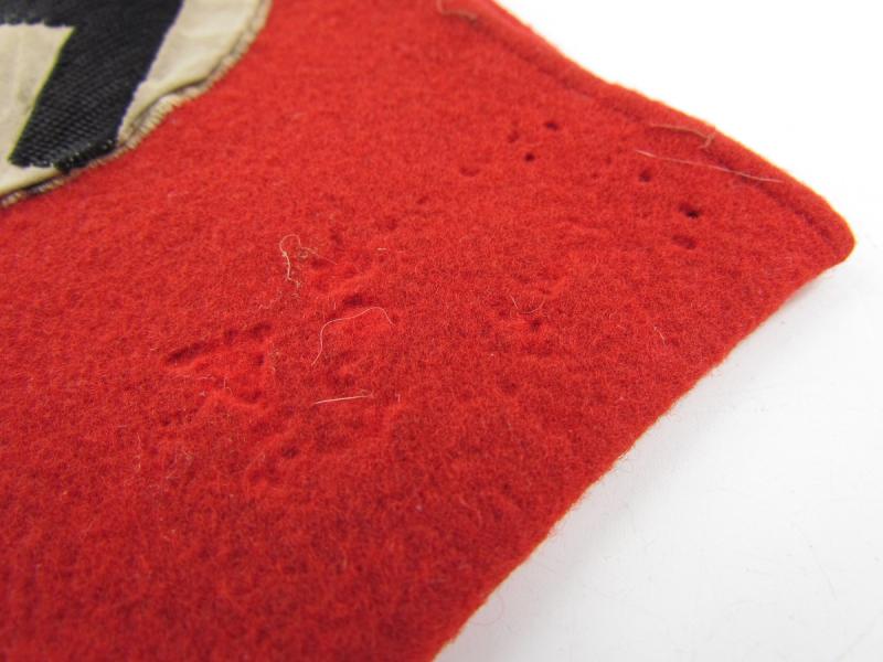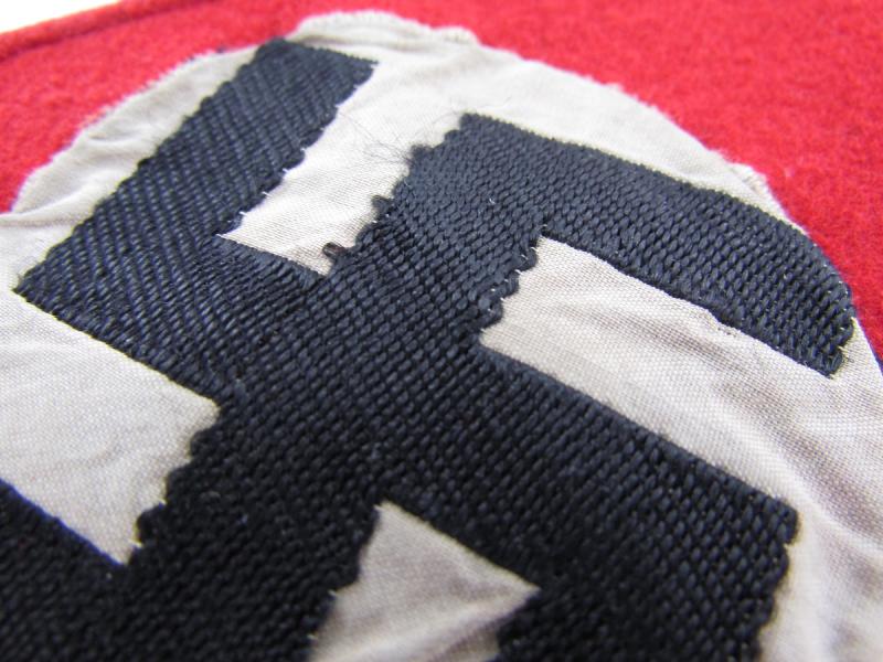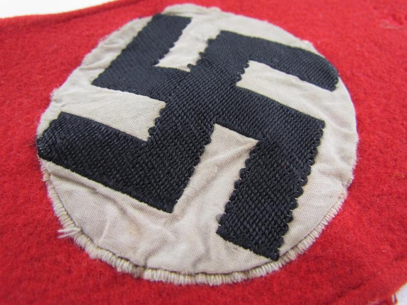 This is a nice NSDAP Member's Armband (Armbinde) as worn on the various tunics. The armband is showing a machine-woven black coloured swastika, machine-woven on a white roundel, the roundel is machine-sewn on a red woolen armband.
