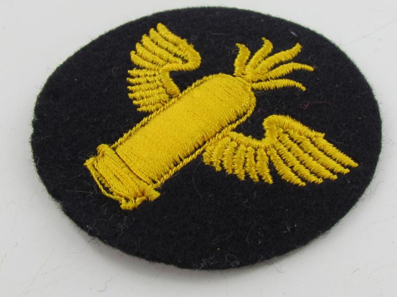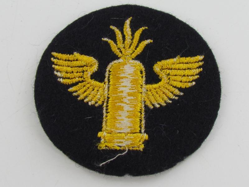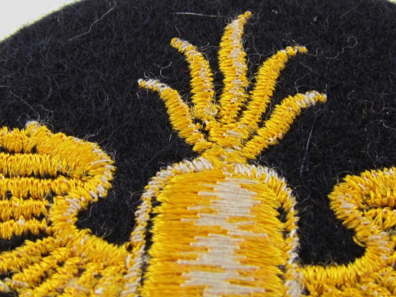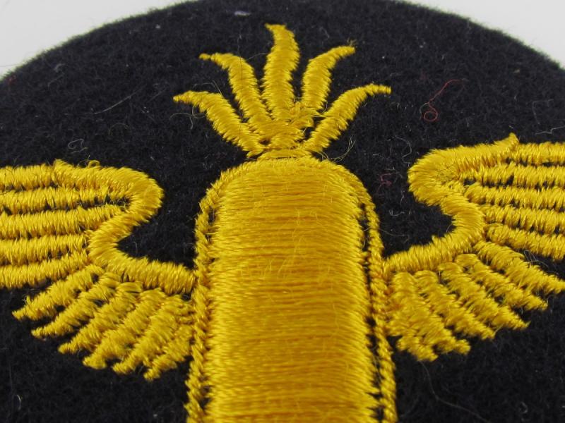 The insignia consists of a roughly, 60mm diameter, navy blue wool base with a machine embroidered winged artillery shell with "flames" emanating from the top edge in bright, golden yellow, cotton threads