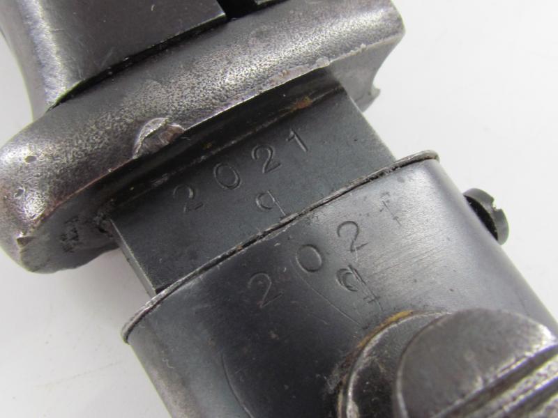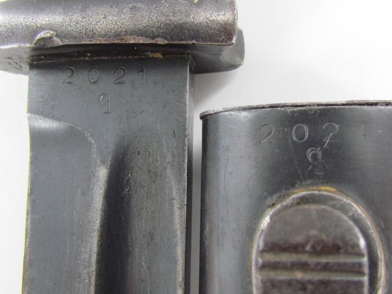 The bayonet is matching to its scabbard with the serial 2021 q and has nice clean bakelite grips