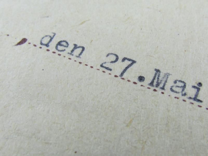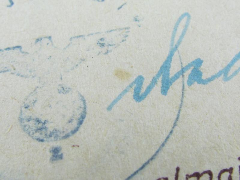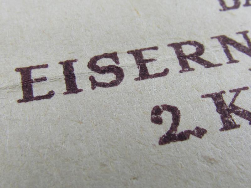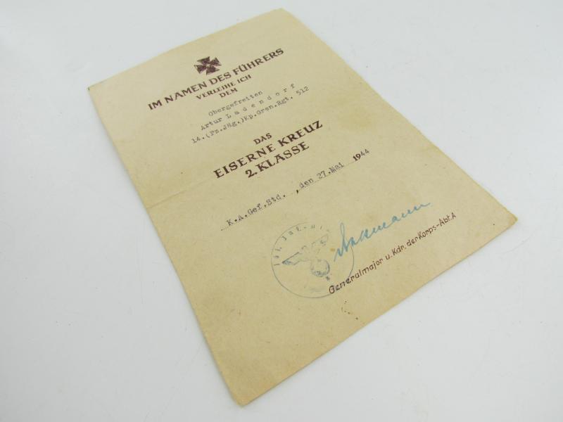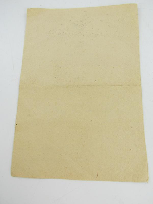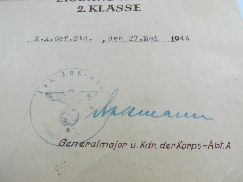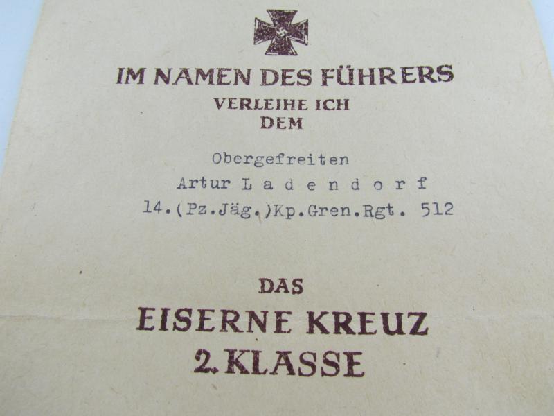 The second class medal was for award to personnel who performed a single act of bravery in combat. This award document was awarded to Obergefreiten 'Artur Ladendorf ' on 27 May1944 In a good condition