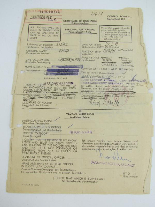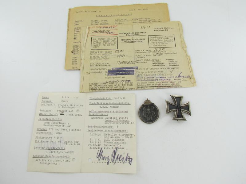 Small grouping paperwork from Hauptmann Georg Steitz Included is his Personnel card and certificate of discharge on 11 mai 1945 Also his Ost Medal and EK1 ( unmarked )
