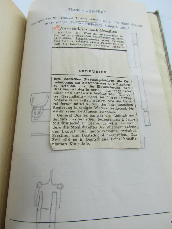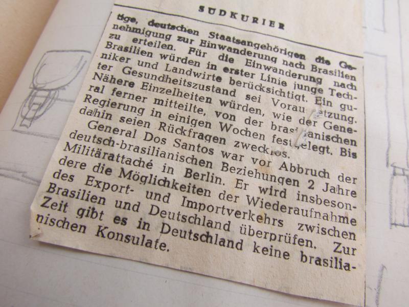A newspaper clipping has been pasted on one page