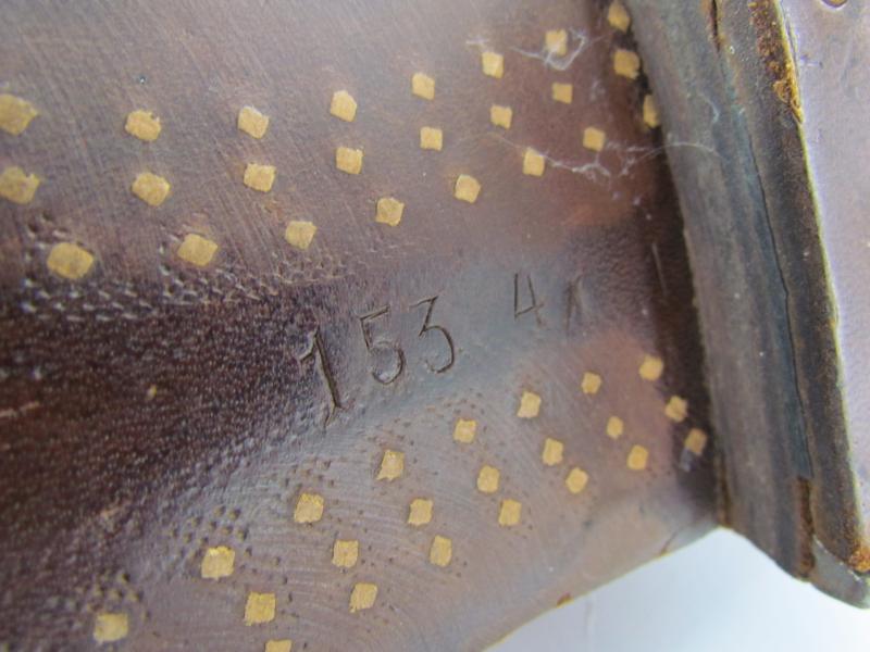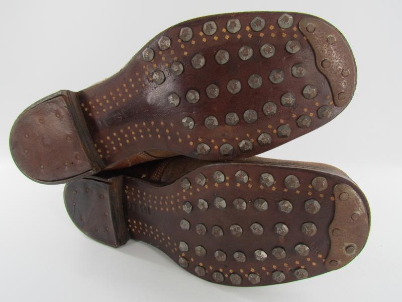 They appear to be in unworn condition and have all the hobnails and wooden pegs attached.