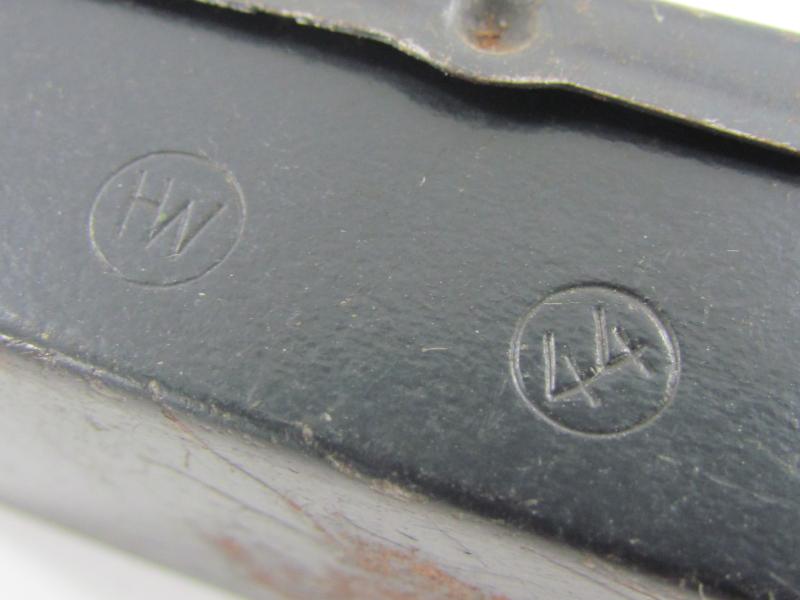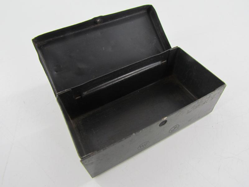 A scarce original late-war small spares tin for the MG42. This particular one retains much of the original factory grey paint and is nicely maker coded and dated 'HW 44'.