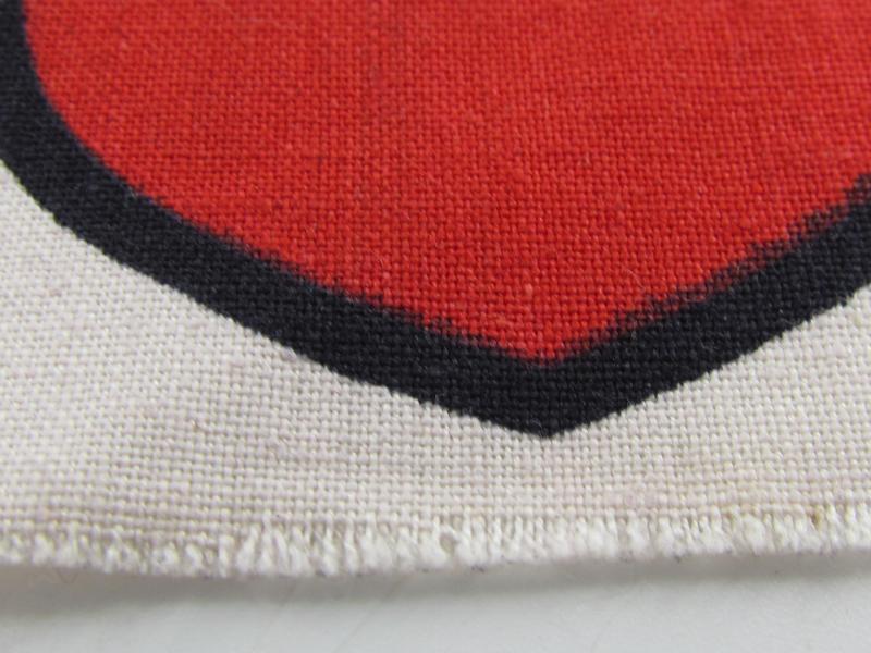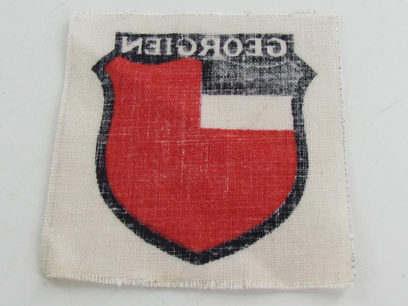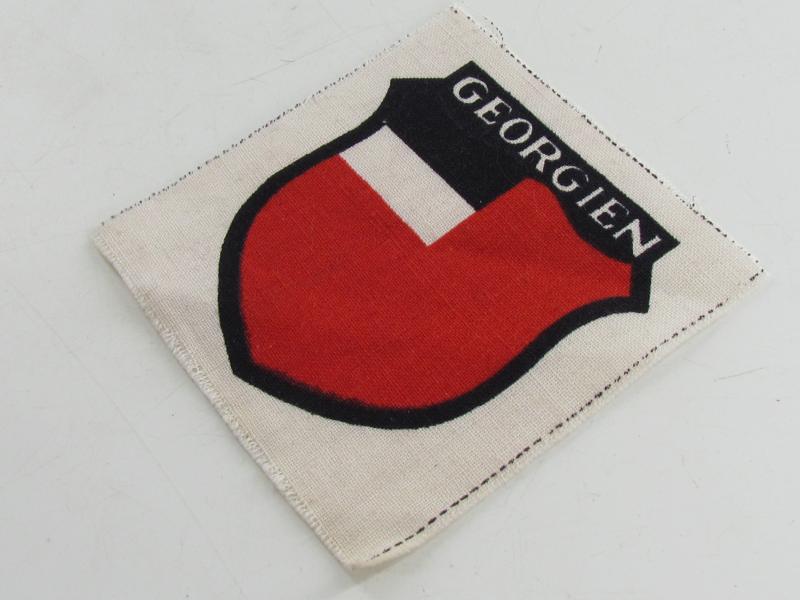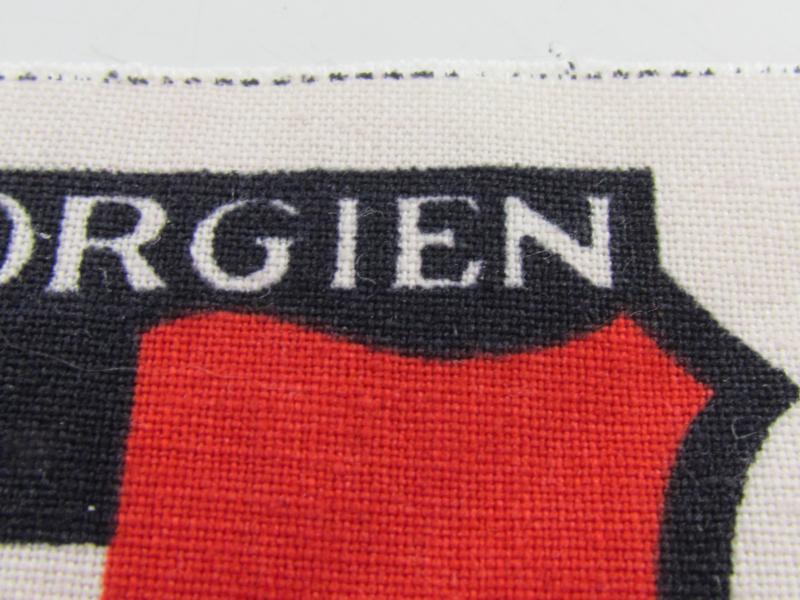 An unissued sleeve insignia for Eastern Volunteers to the Georgian Legion. Cut from a roll the shield is printed on a white cotton backing in very good condition