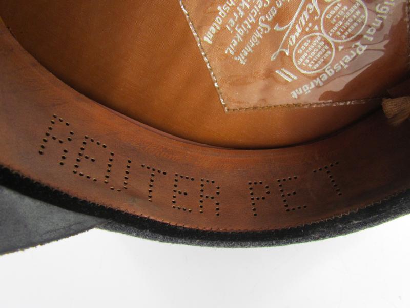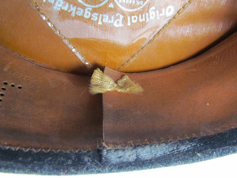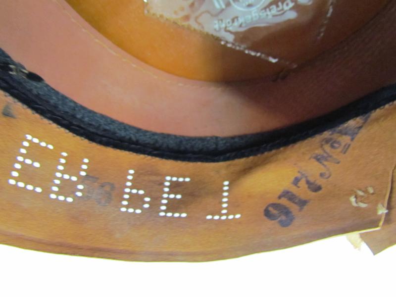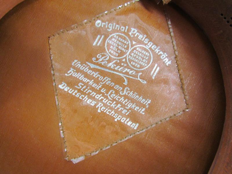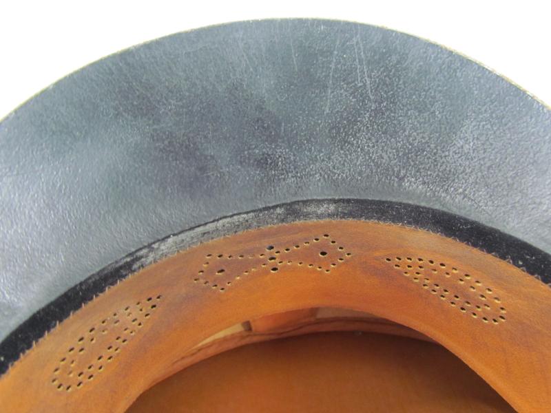 The cap is complete with it's original 2nd pattern enamelled DRK cap eagle, an aluminum DRK wreath and cockade, and a blackened leather chinstrap in good condition.