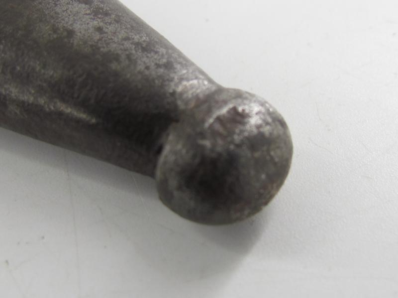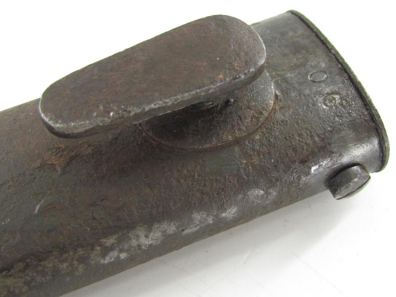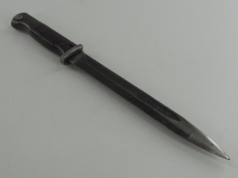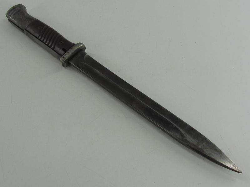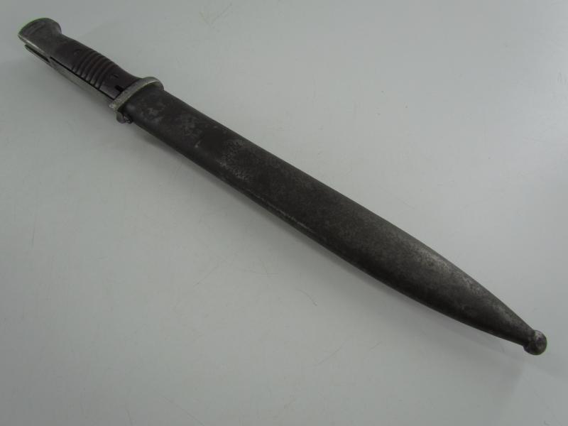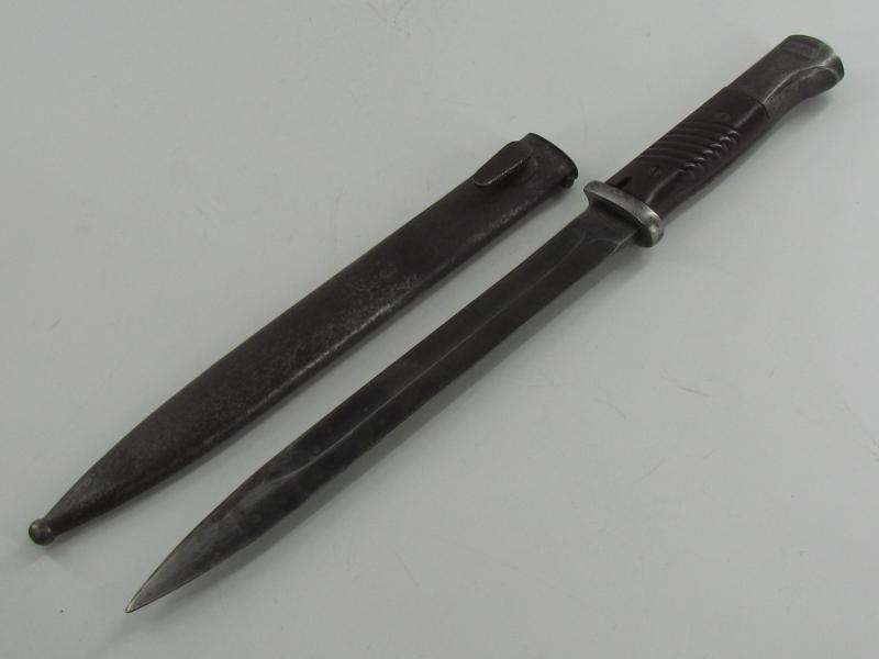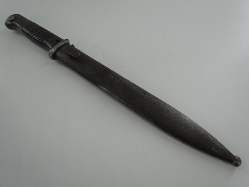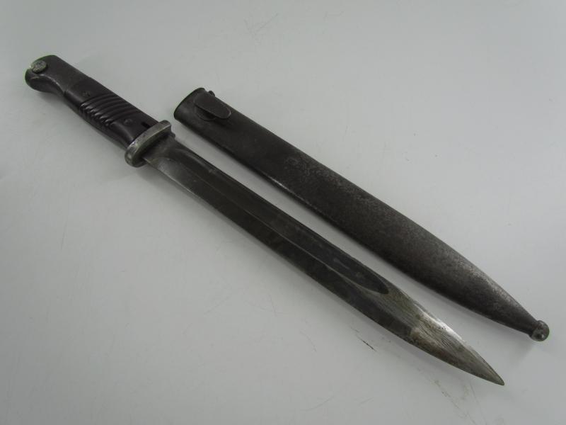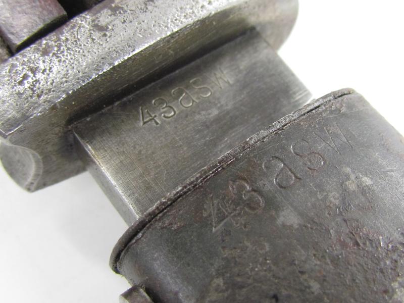 A very nice matching bayonet marked 43 asw indicating production by E. & F. Horster & Co. Solingen in 1943. The bayonet is matching to its scabbard with the serial 1106 and has nice bakelite grips.