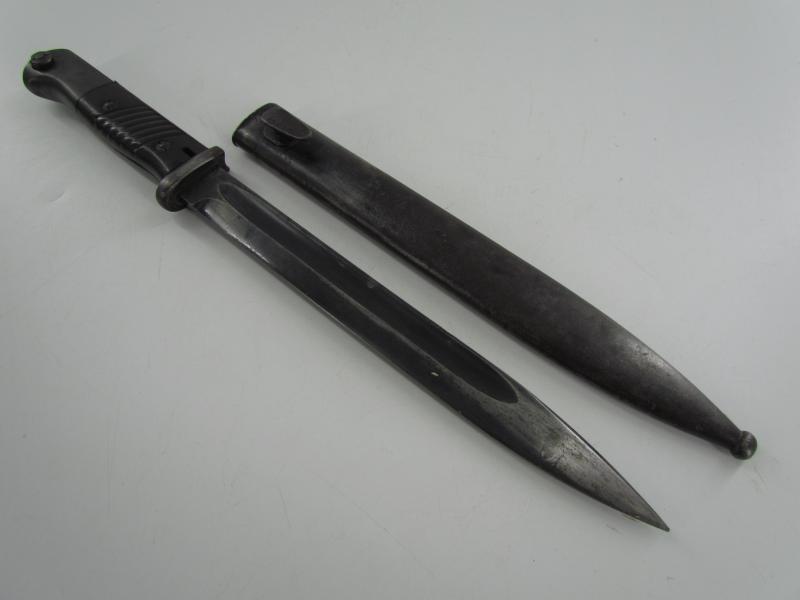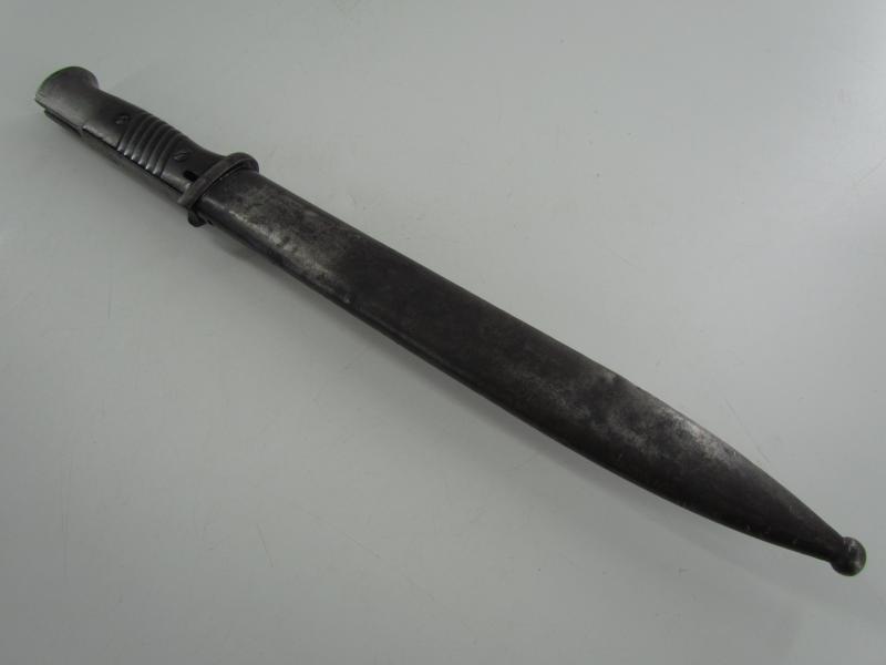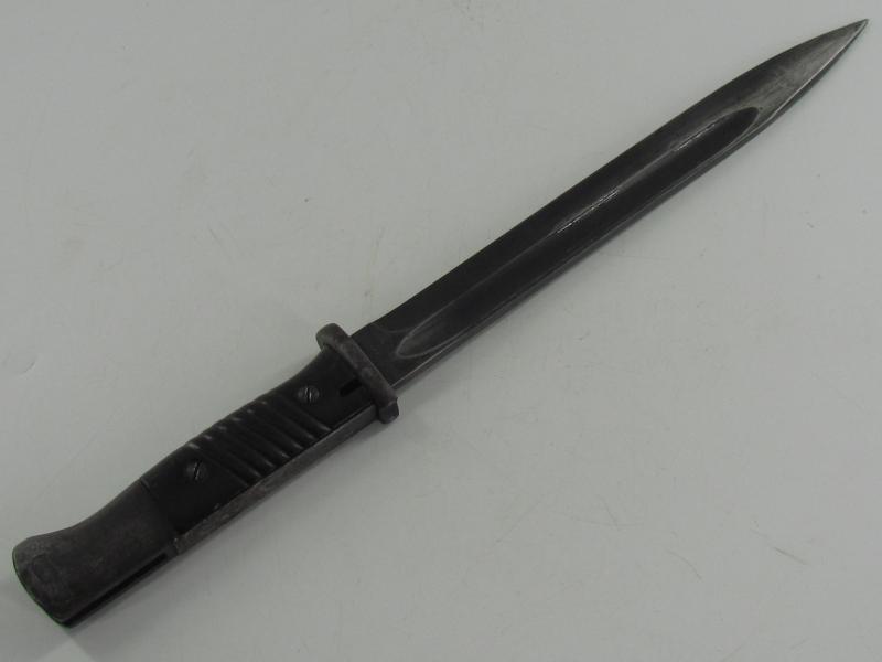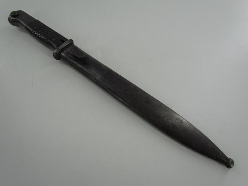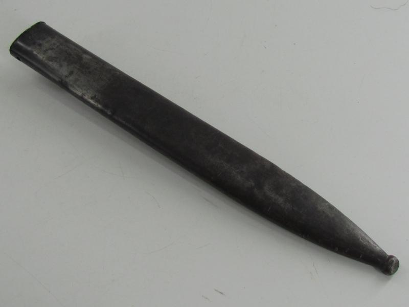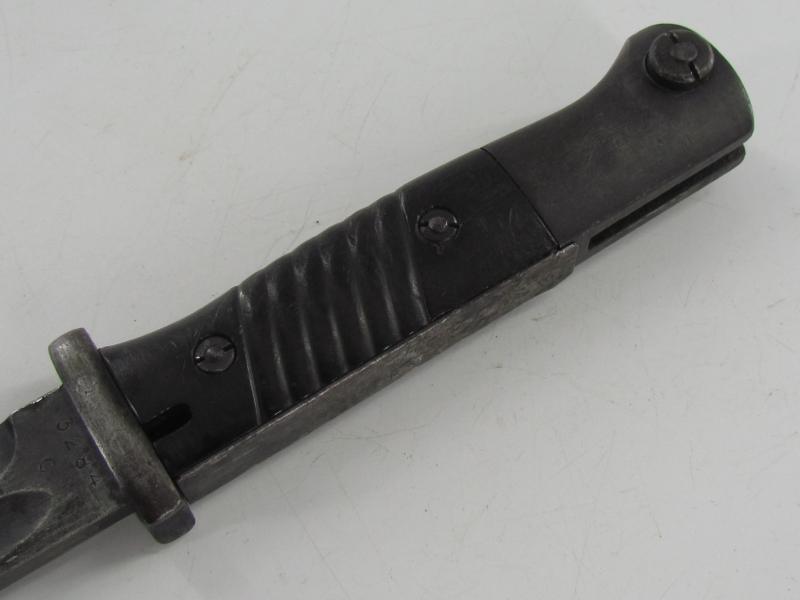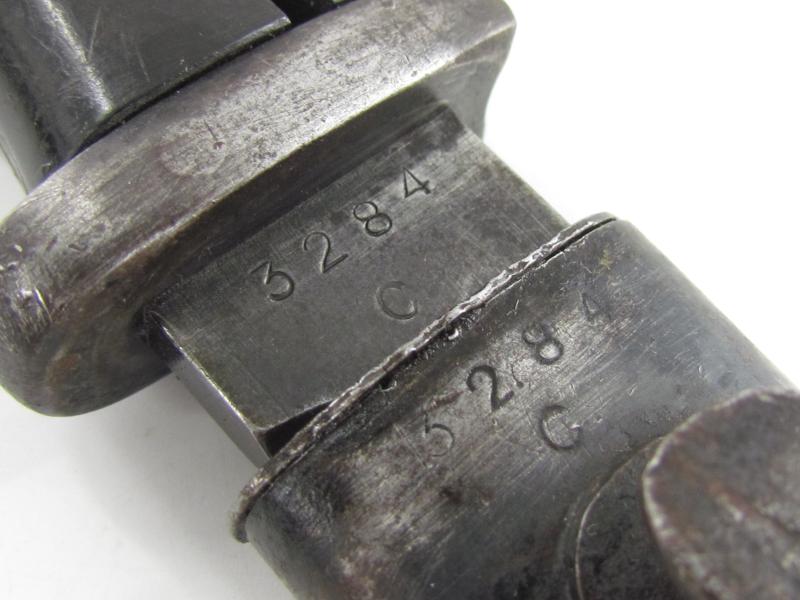 The bayonet has never been sharpened or reblued. The bayonet is matching to its scabbard with the serial 3284 and has nice bakelite grips.