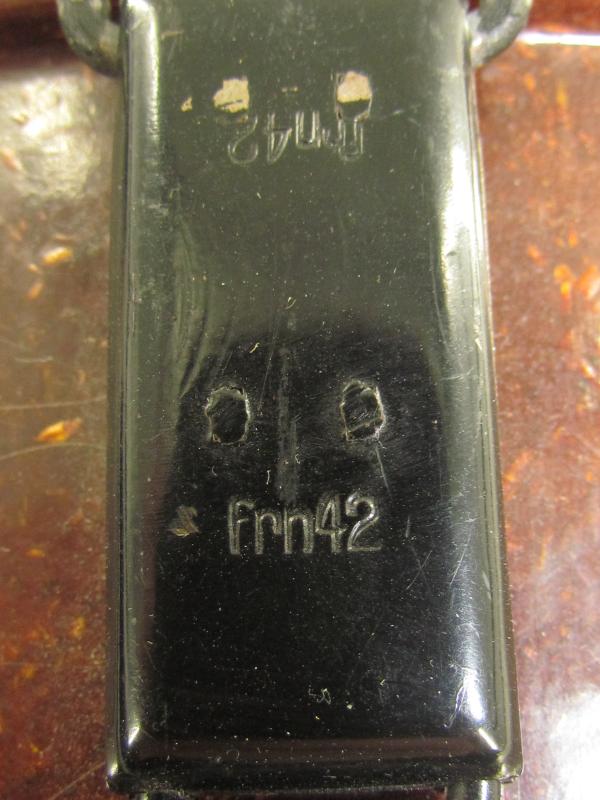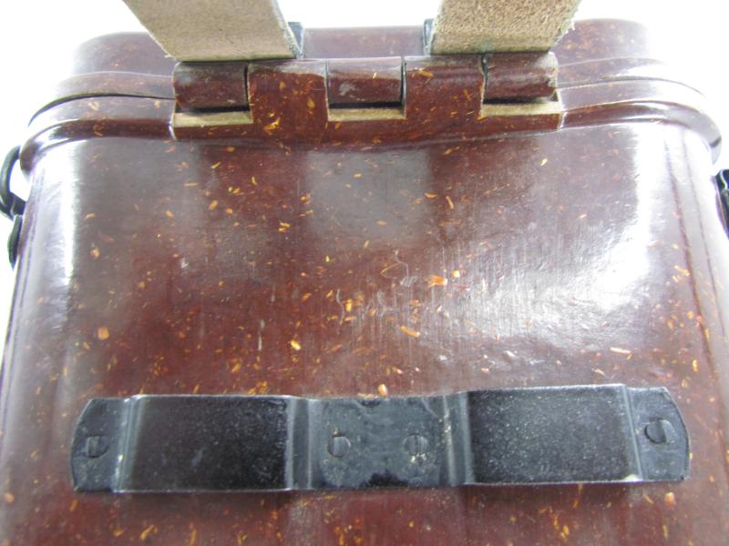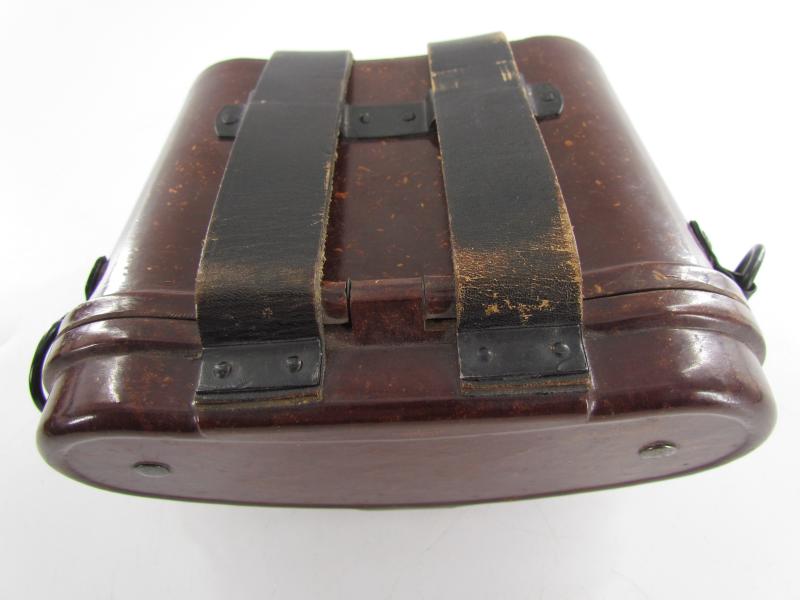 Complete with both d-rings for the strap on each side. The small leather pulling strap is also present. The leather straps on the back are present and supple (some little surface cracks). The case is marked 'frn42' on the pulling strap and has some bakelite markings and a serial number on the inside.
