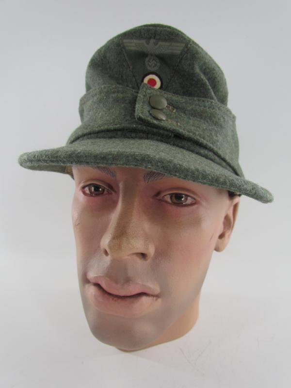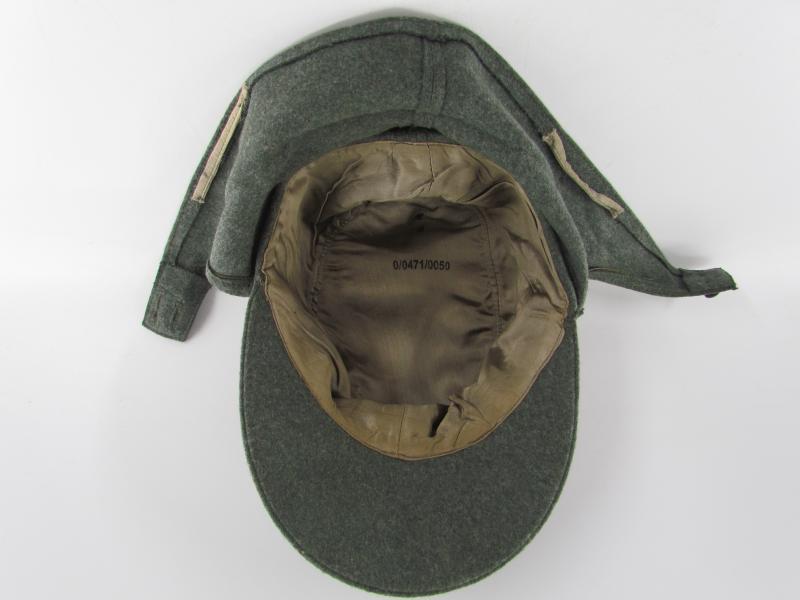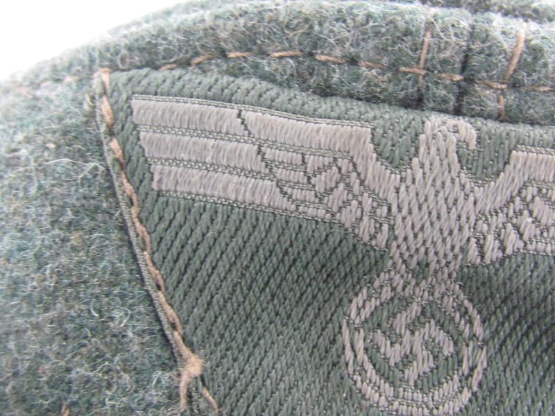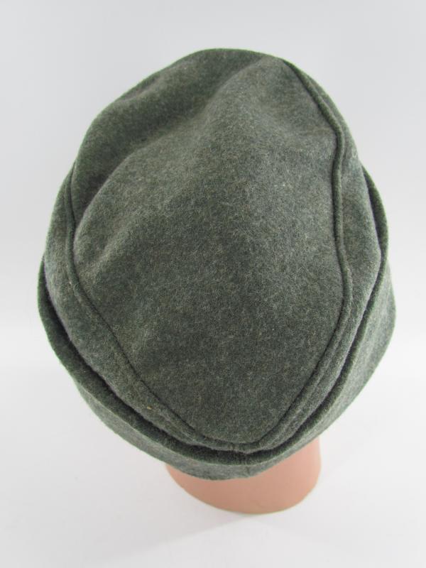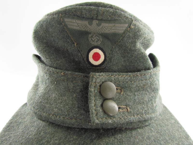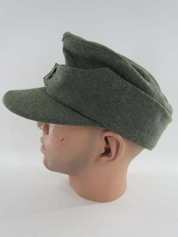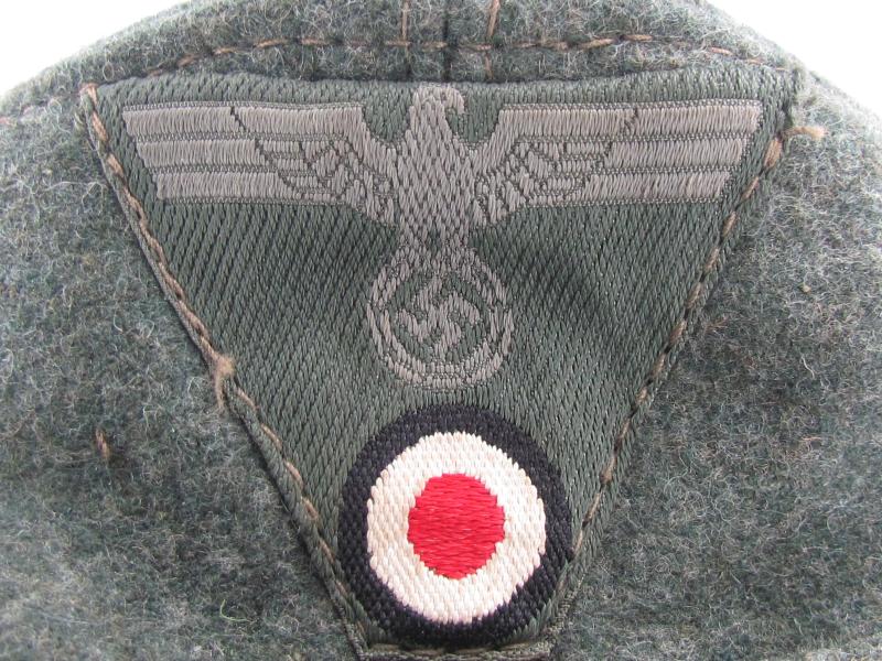 German Heer M43 EM/NCO field cap. Constructed from a late-war type feldgrau wool. The cap retains its factory applied trapezoid T-insignia that is machine stitched