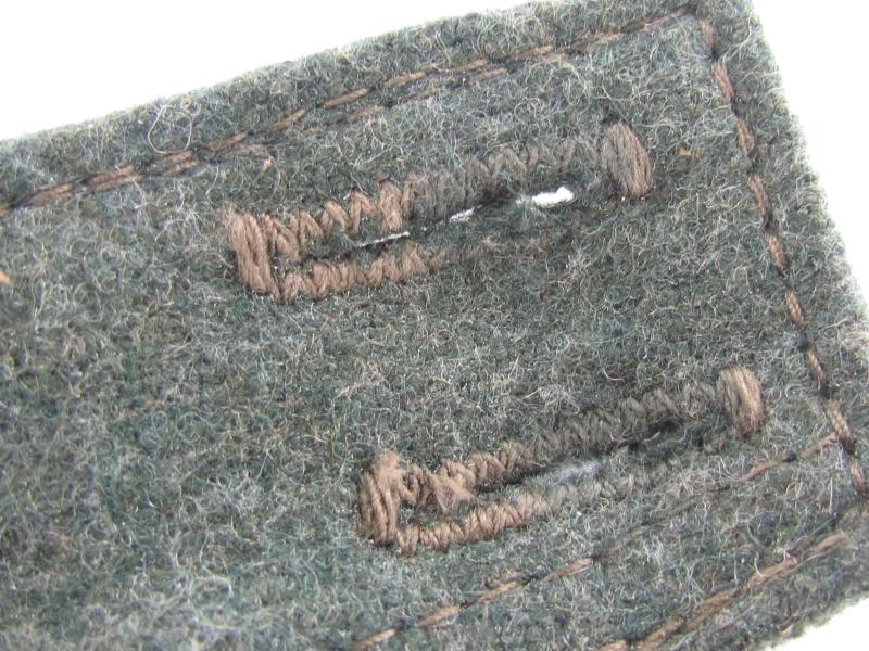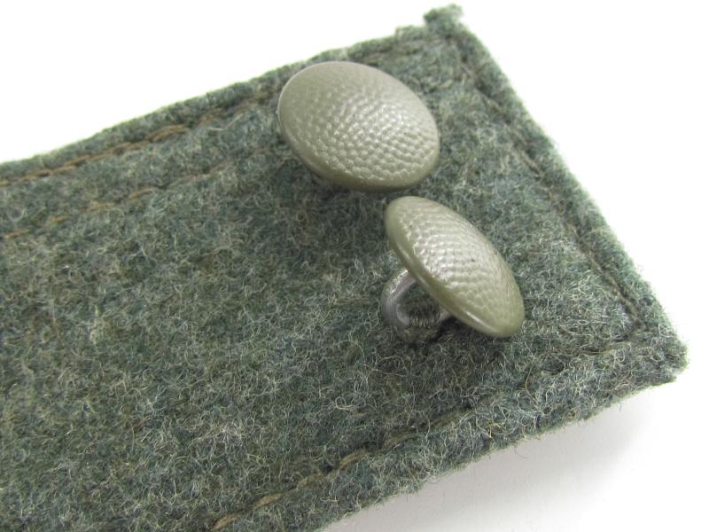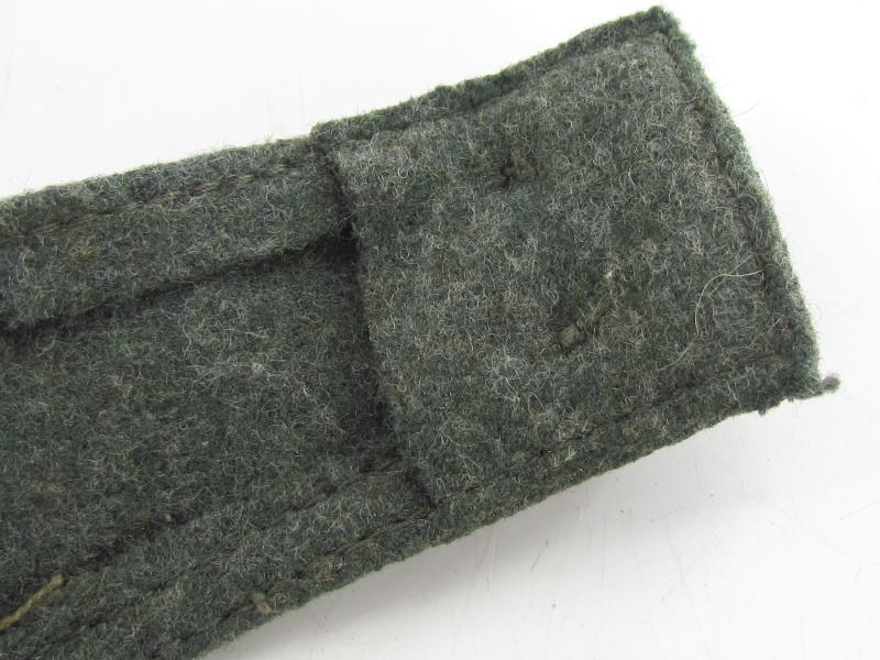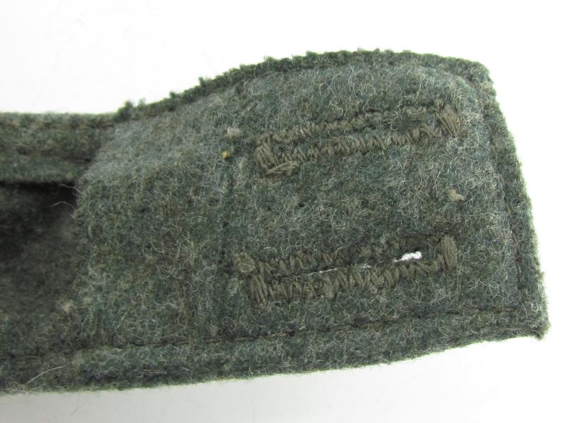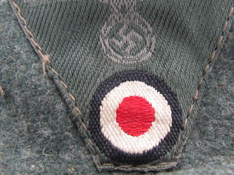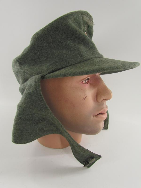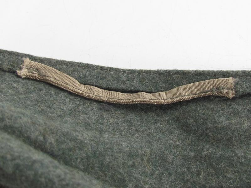 German Heer M43 EM/NCO field cap. Constructed from a late-war type feldgrau wool. The cap retains its factory applied trapezoid T-insignia that is machine stitched