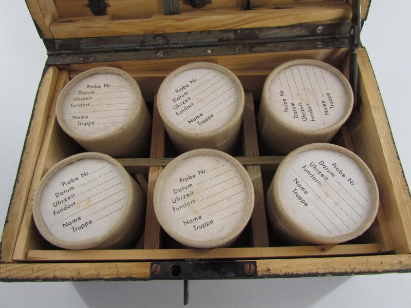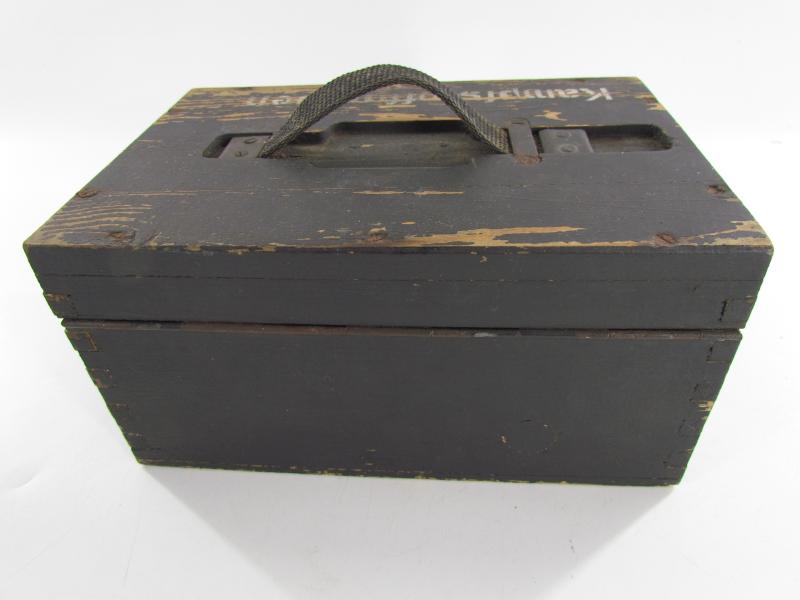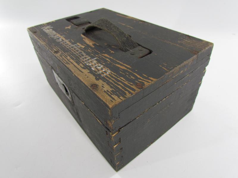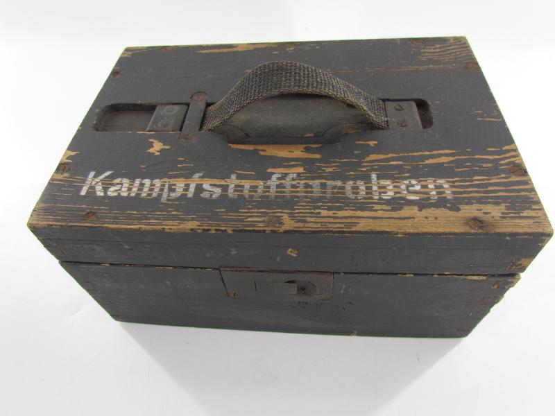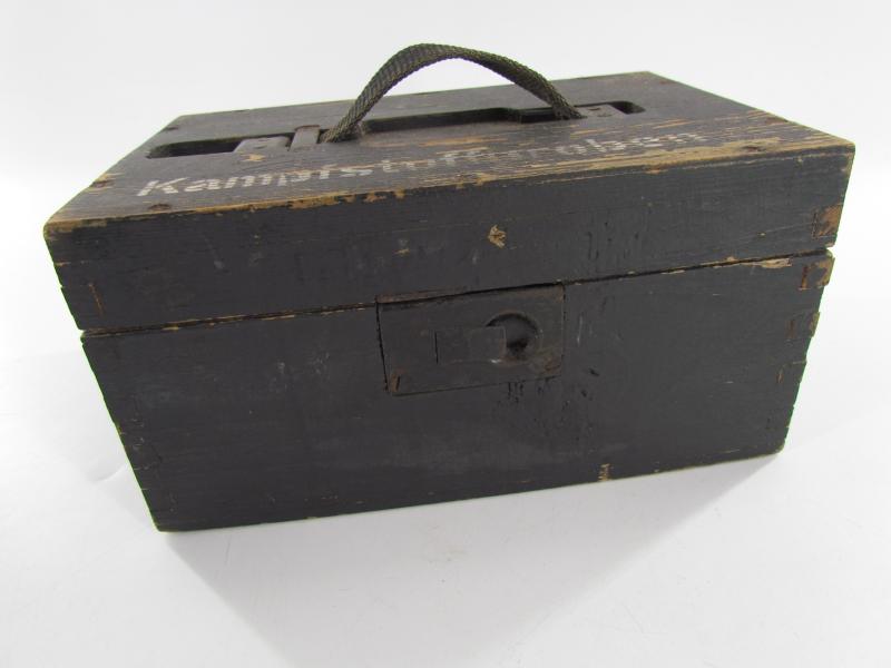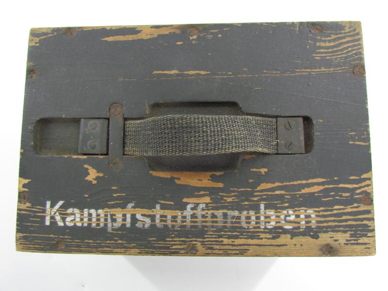 This is a nice original Wehrmacht wooden box for 'Kampfstoffproben' (chemical warfare test equipment box). The box is not visible maker marked or dated. The box is nicely painted in fieldgrey, on top of the box is stencilled in white paint 'Kampfstoffproben'.