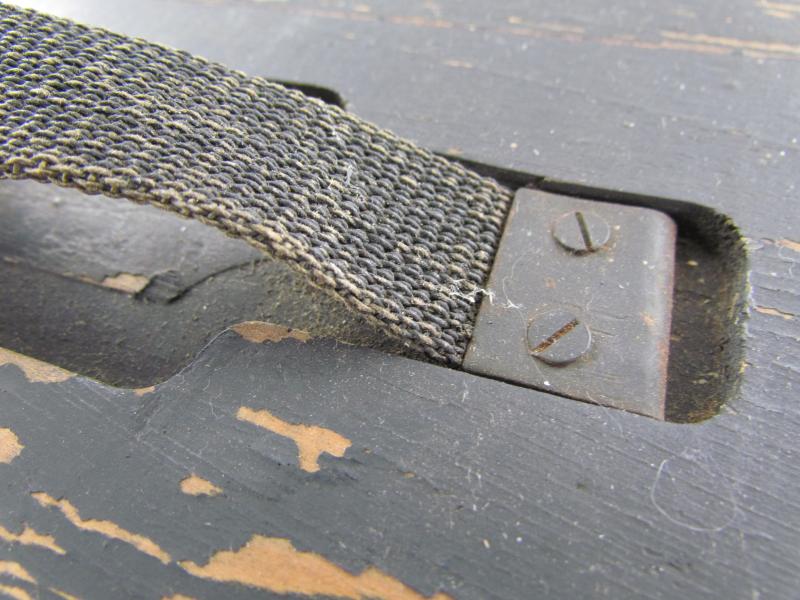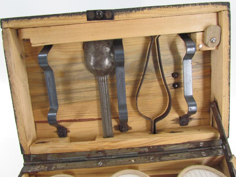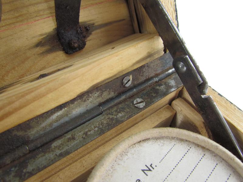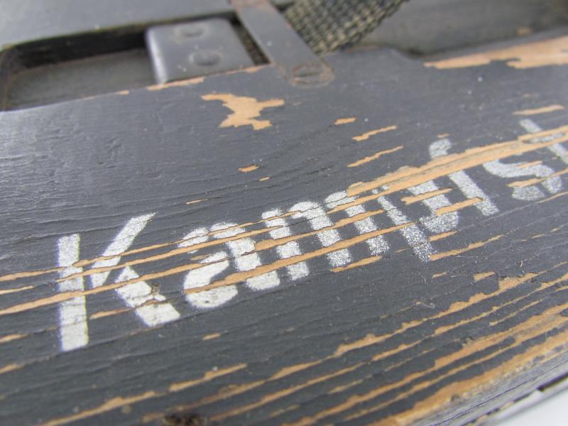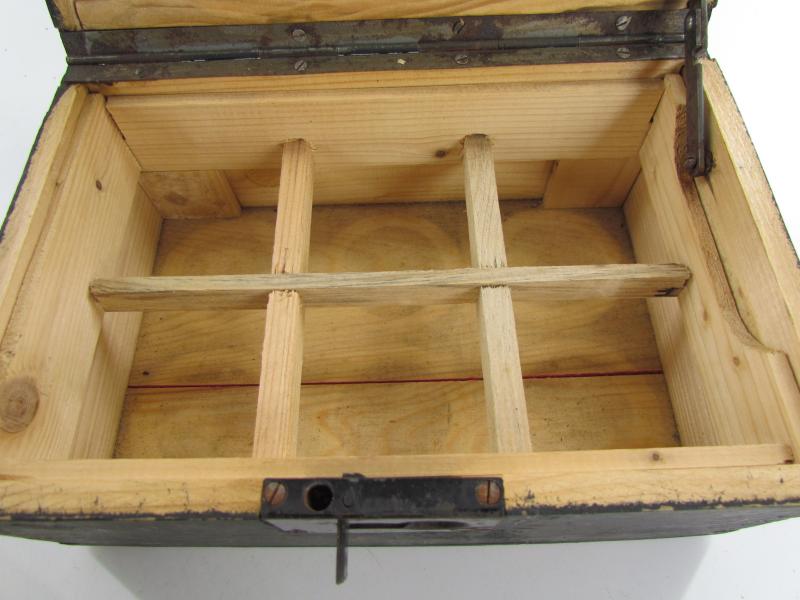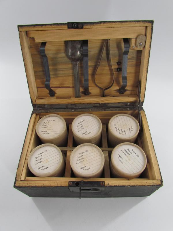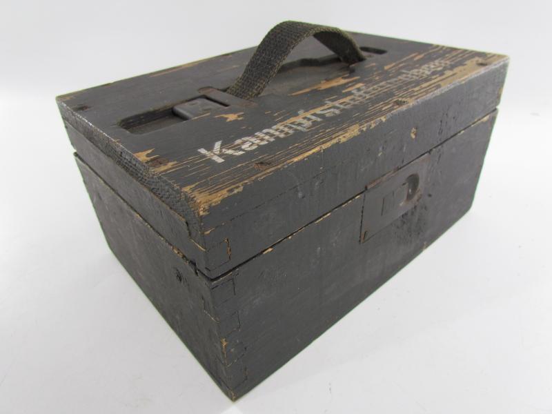 This is a nice original Wehrmacht wooden box for 'Kampfstoffproben' (chemical warfare test equipment box). The box is not visible maker marked or dated. The box is nicely painted in fieldgrey, on top of the box is stencilled in white paint 'Kampfstoffproben'.