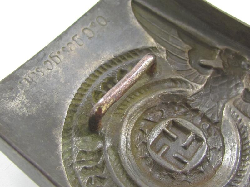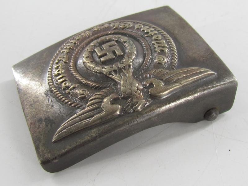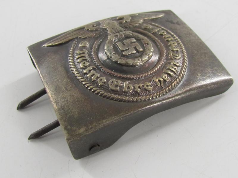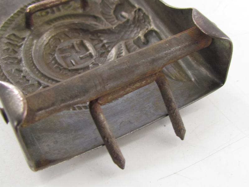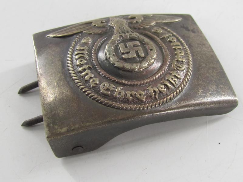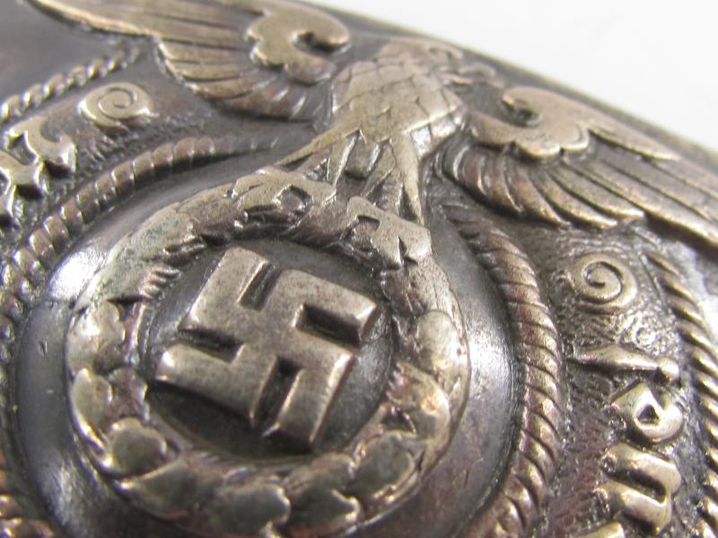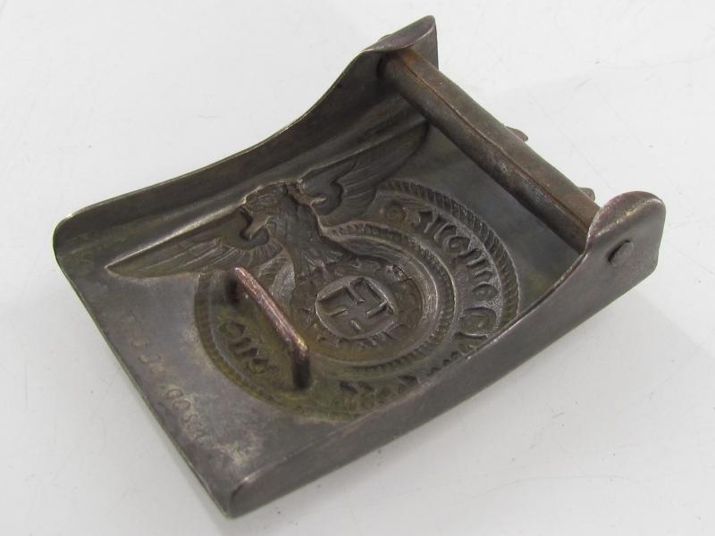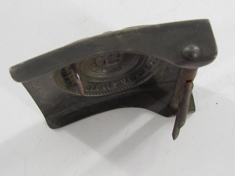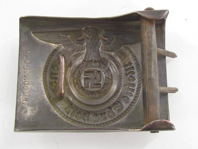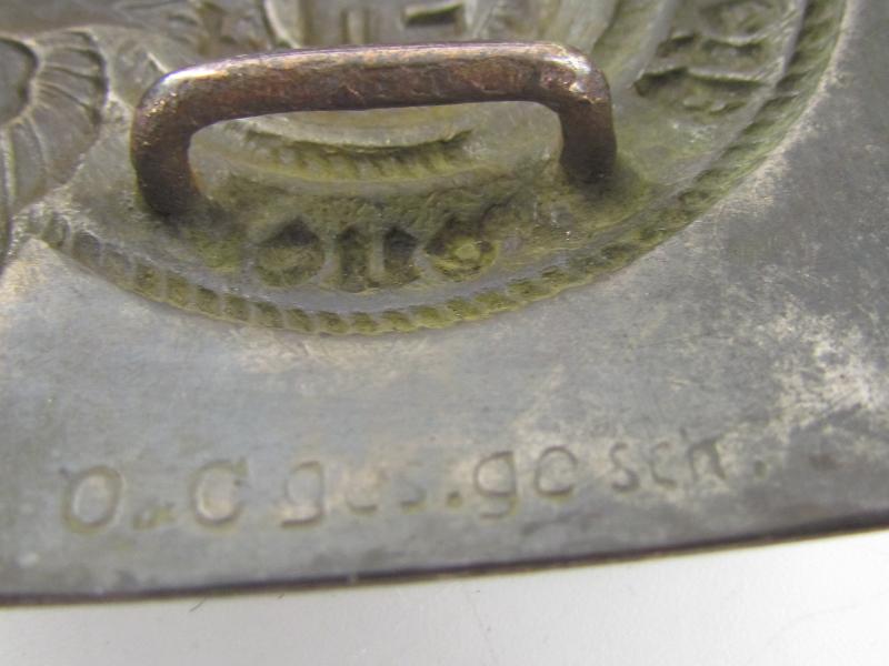 early made Waffen-SS buckle in nickel silver. Maker marked on the reverse by Overhoff & Cie, Lüdenscheid (O&C ges. gesch.). Shows great wear and patina!
