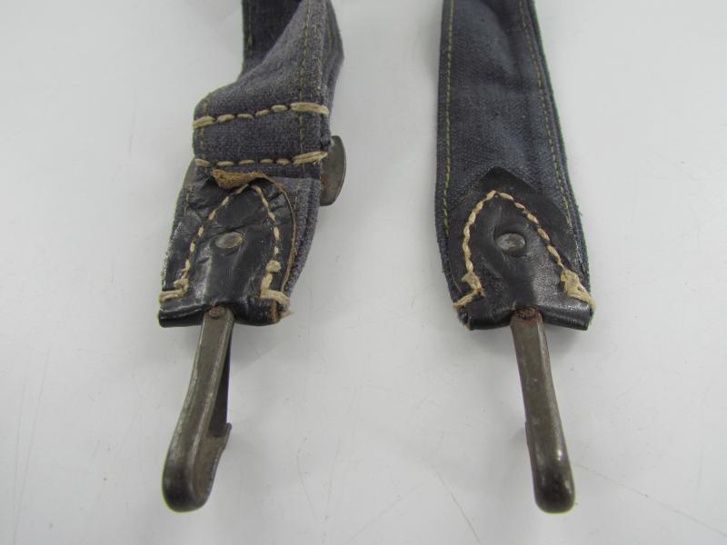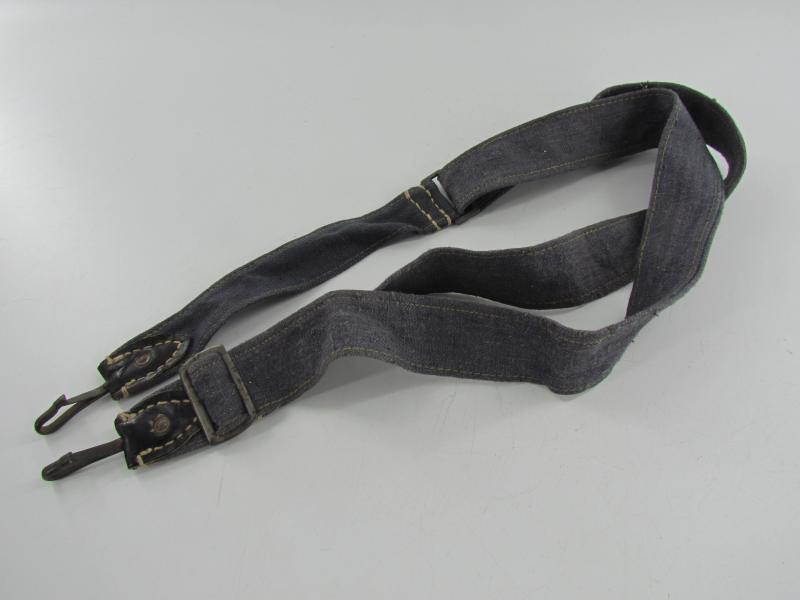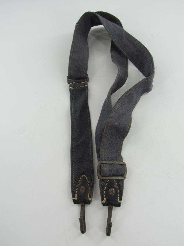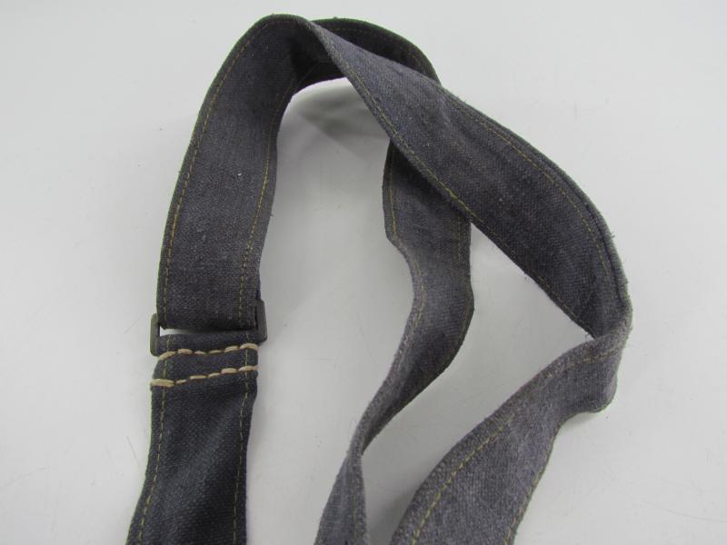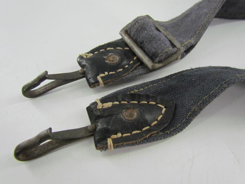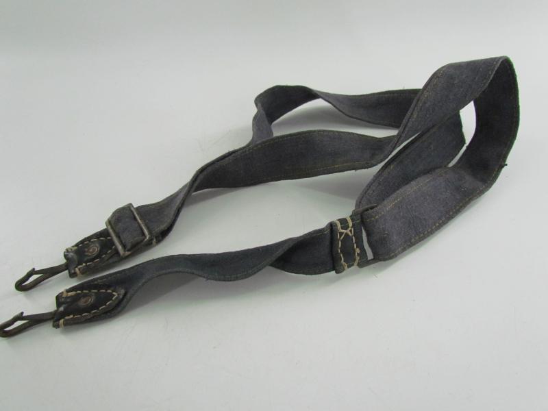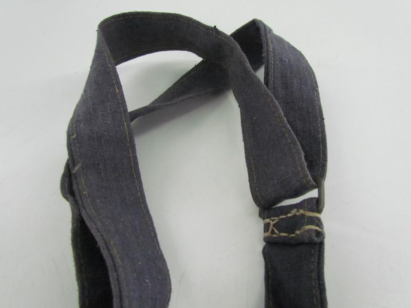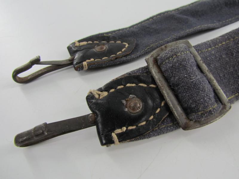In a used but very good condition a Luftwaffe breadbag strap Nice dark blue/grey canvas construction breadbag strap with leather reinforced steel friction clips to either end