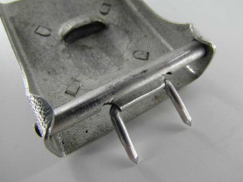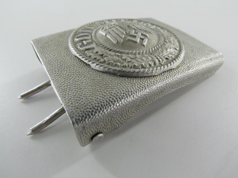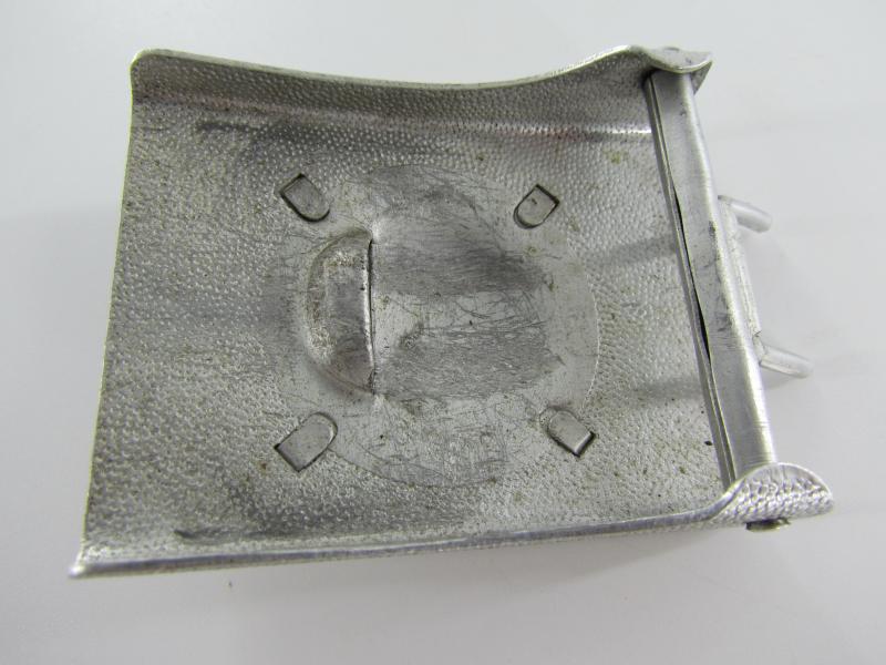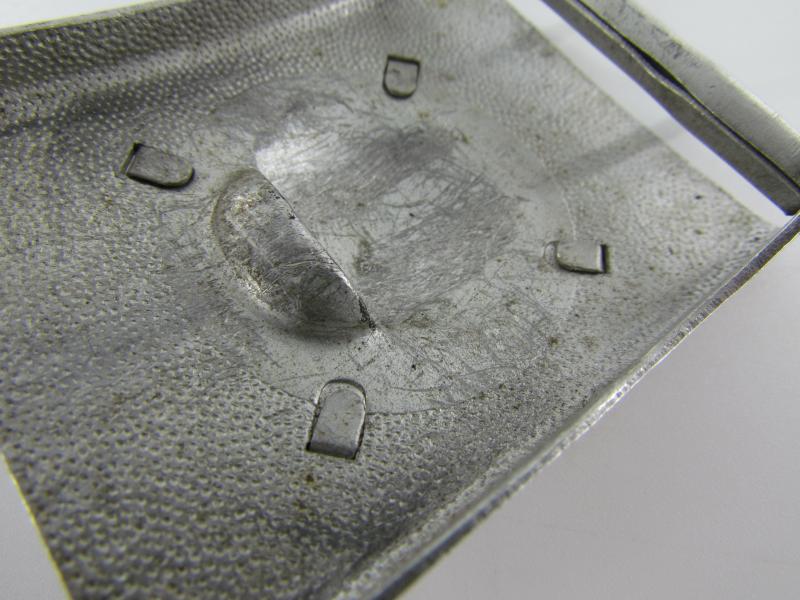 This is a nice 2-piece aluminum construction parade style box buckle with a pebbled background, the separate frontplate is attached with four prongs.