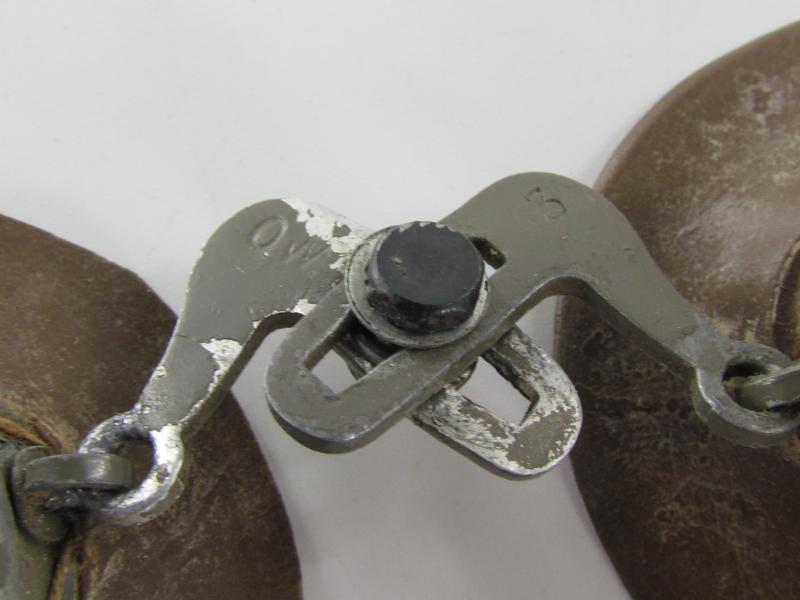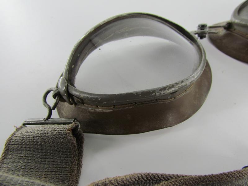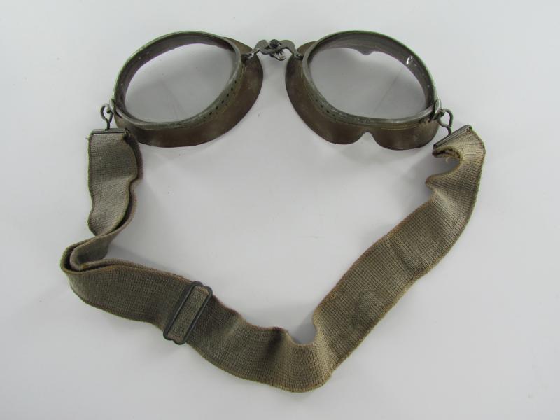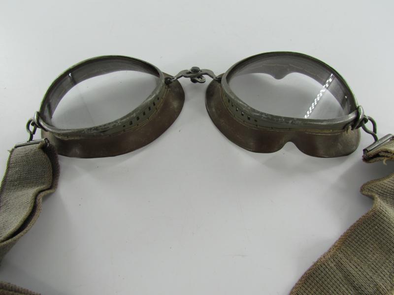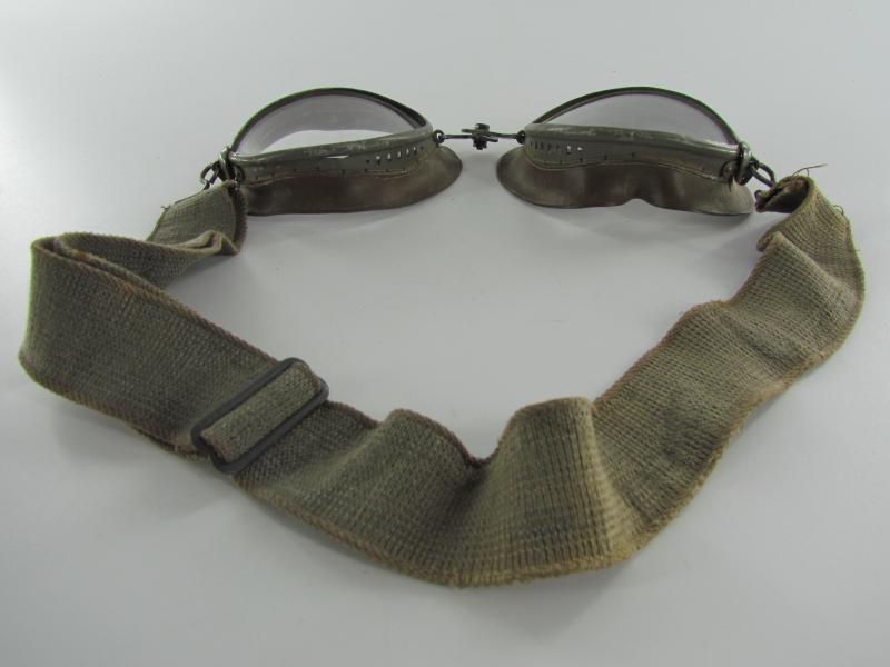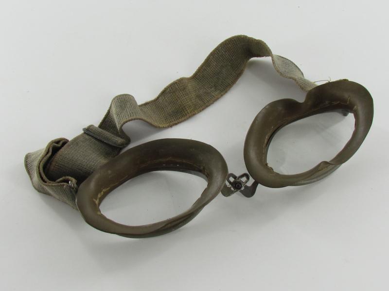 A very nice original pair of dust goggles marked OW43. The elastic in the band is still strong and the glass is still in one piece.