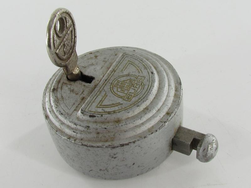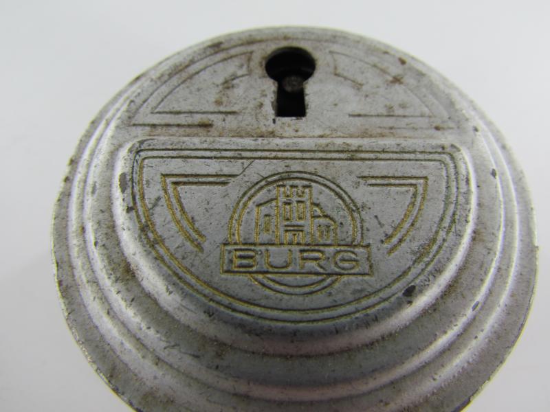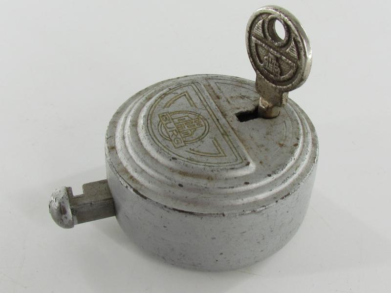 A RARE puck style round Burg padlock. This lock is in super good condition and comes with its original key The back is stamped:No. 20 DRP ( Deutsches ReichsPatent )