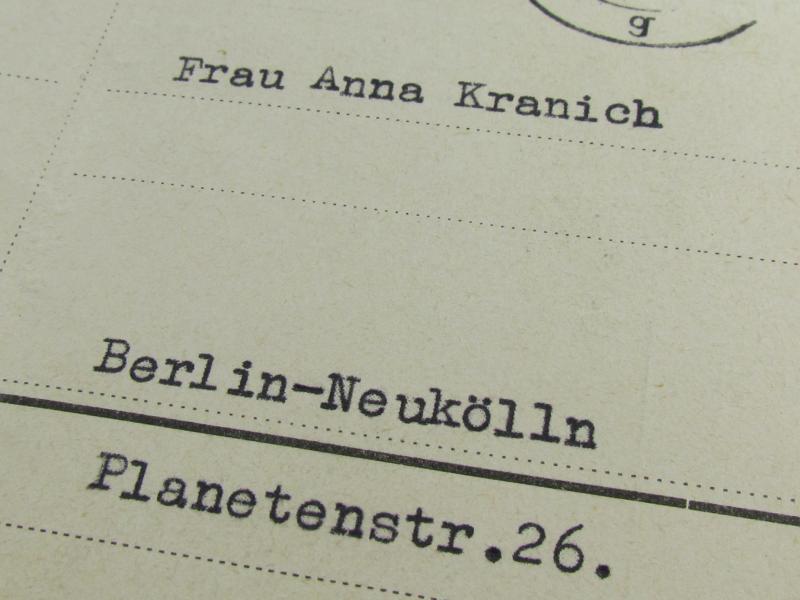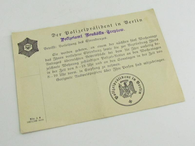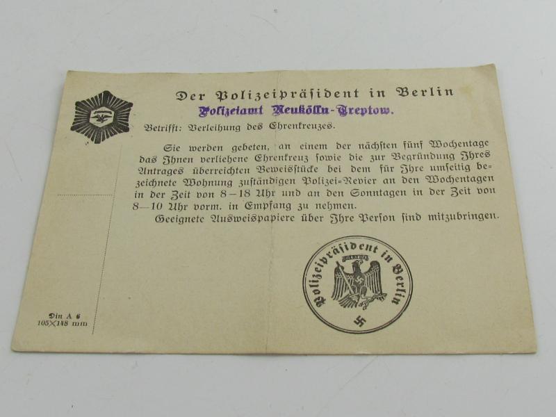 announcement of the Police President of Berlin for the collection of the cross of honor to be awarded to Mrs Anna Kranich in a very good condition!