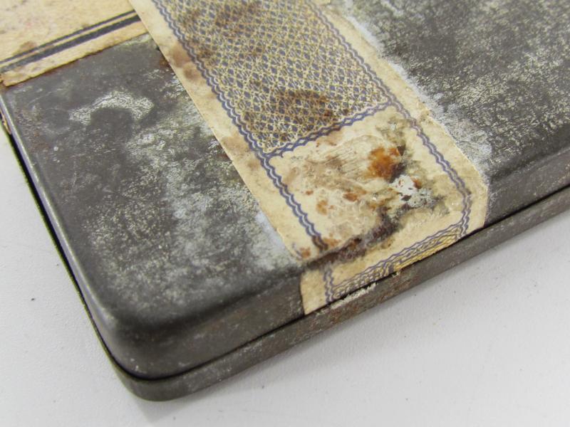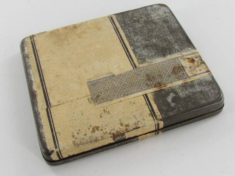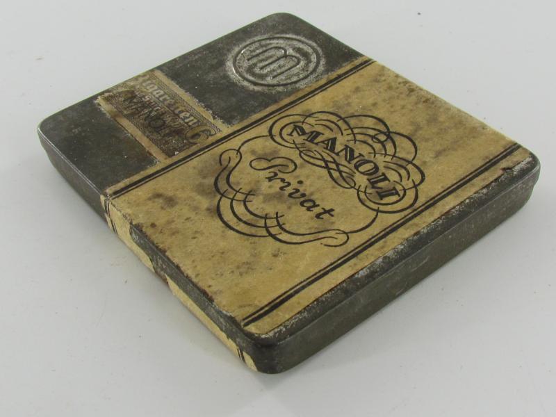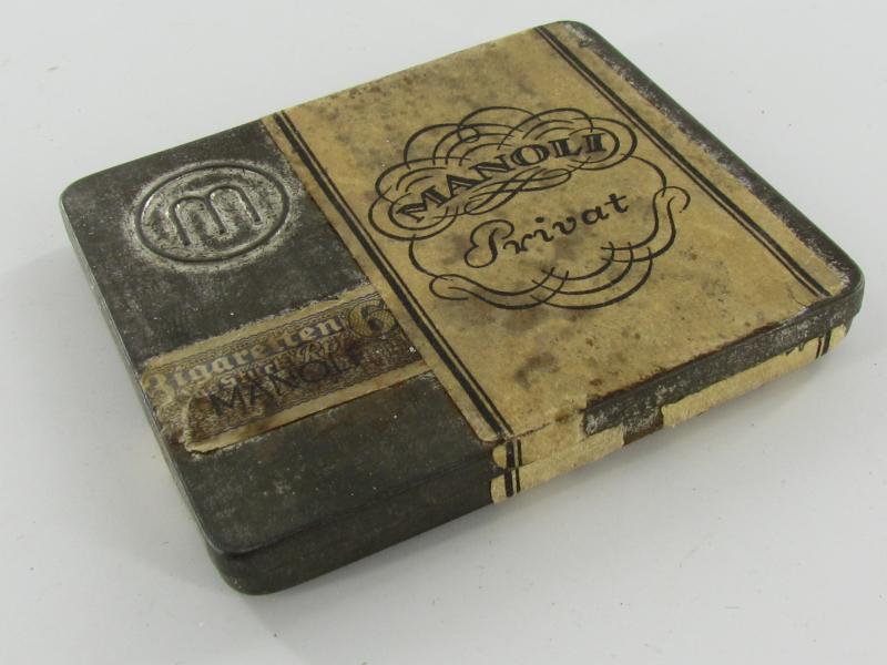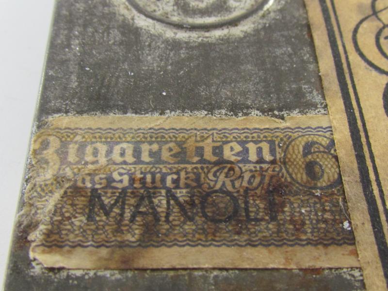 Original 1930's Manoli Privat cigarette tin. Nice cigarette tin with some wear and age. It still has remnants of its original tax seal priced in Rpf (Reichspfennig) and paper label about 8 x 7 cm