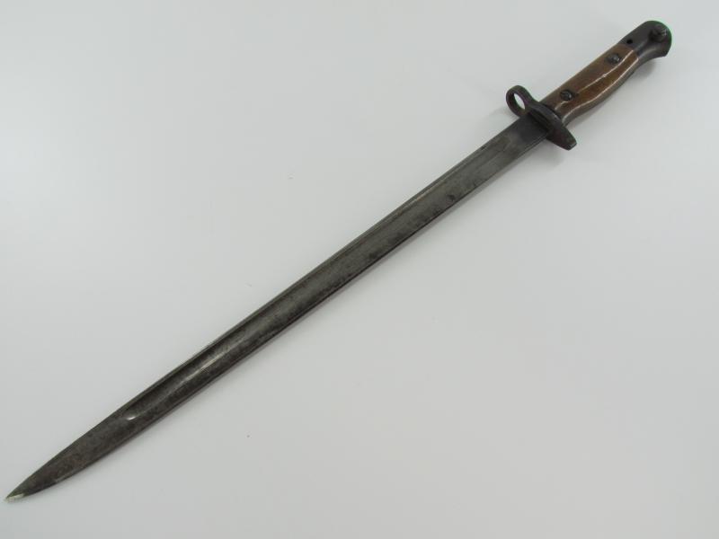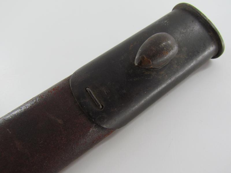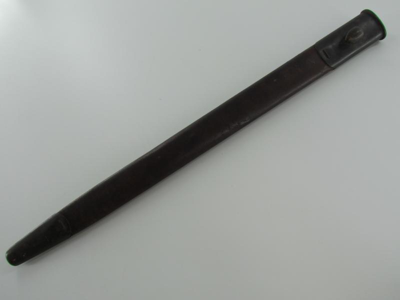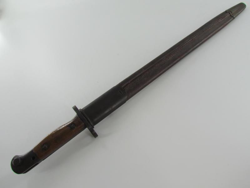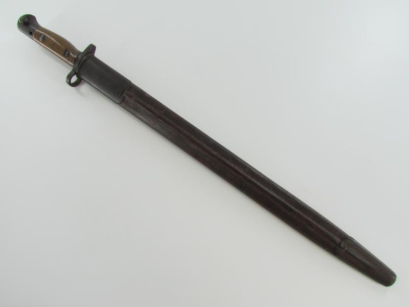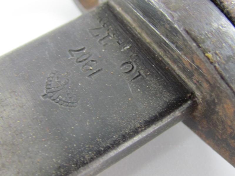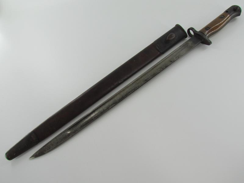 British 1907 Bayonet and Scabbard. The blade is stamped with a crown over "G.R." followed by the date "1907"