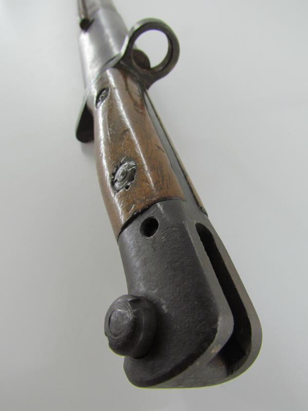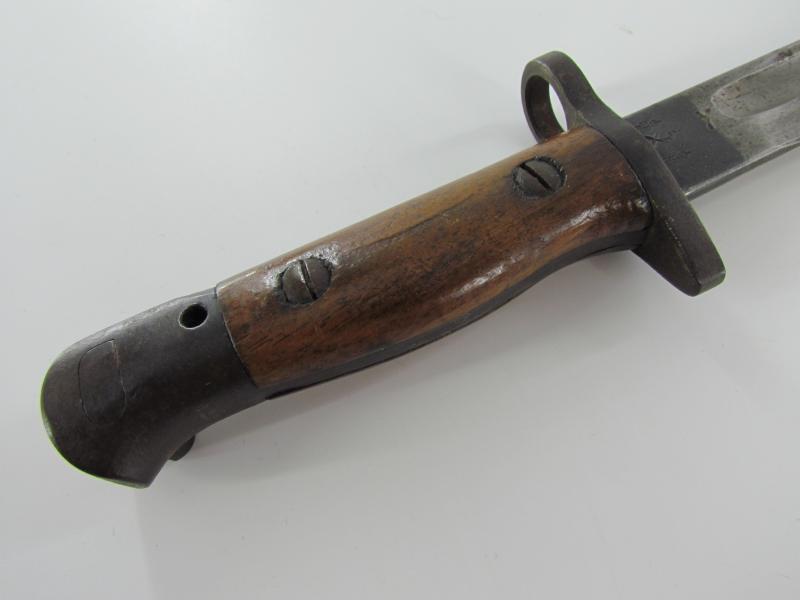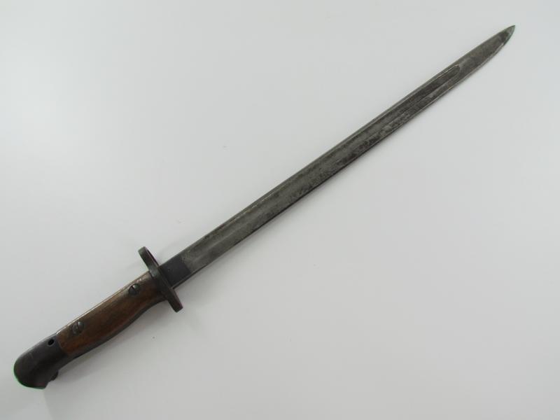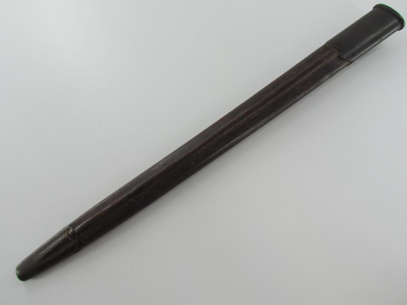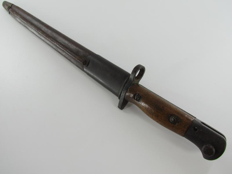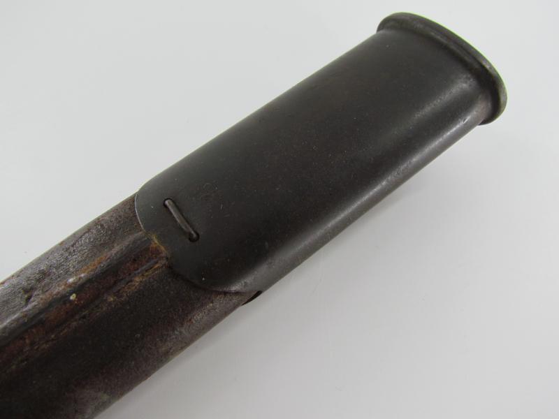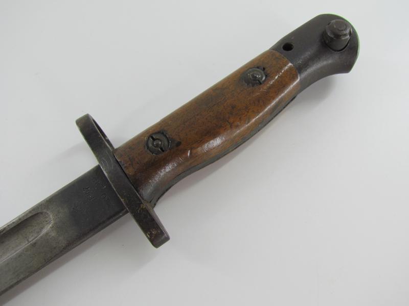 British 1907 Bayonet and Scabbard. The blade is stamped with a crown over "G.R." followed by the date "1907"